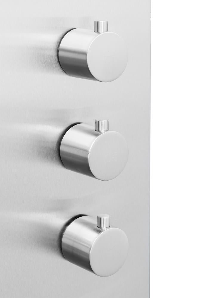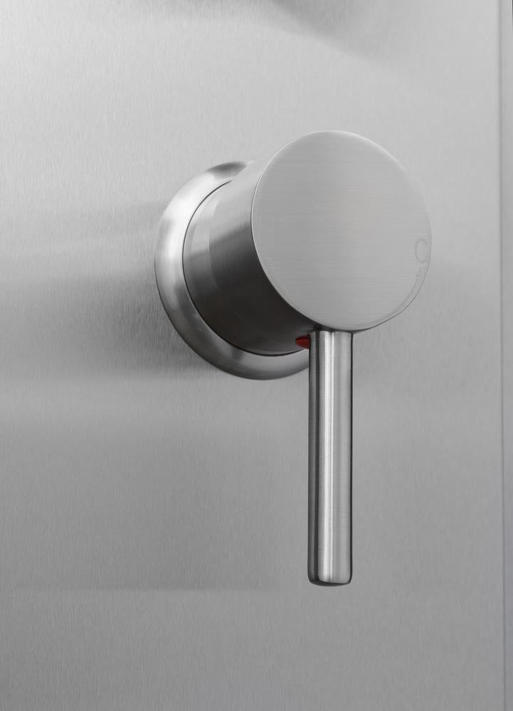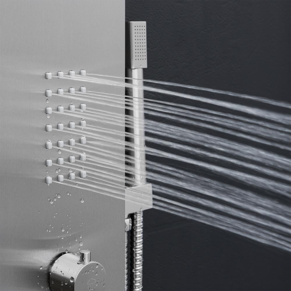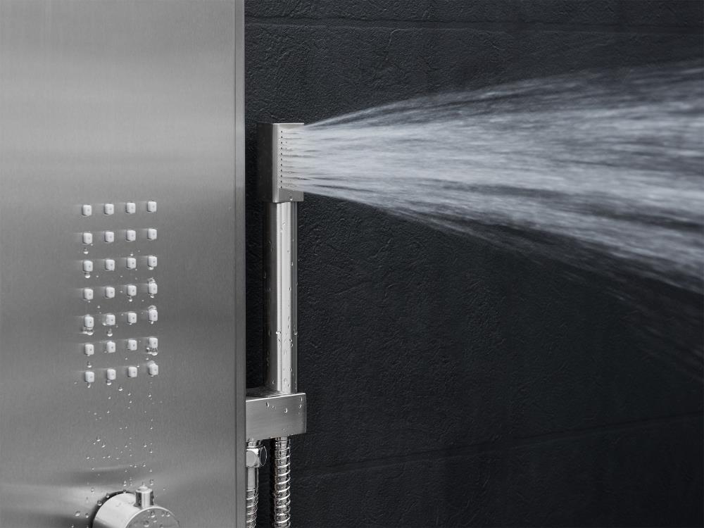 A sleek brushed stainless steel shower panel featuring an integrated rainfall head, 2 body spray jets, and a handheld wand. The 4-way diverter lets you use functions simultaneously, delivering a spa-like experience with 1.8 GPM efficiency. Designed for easy wall-mount installation with valve included.