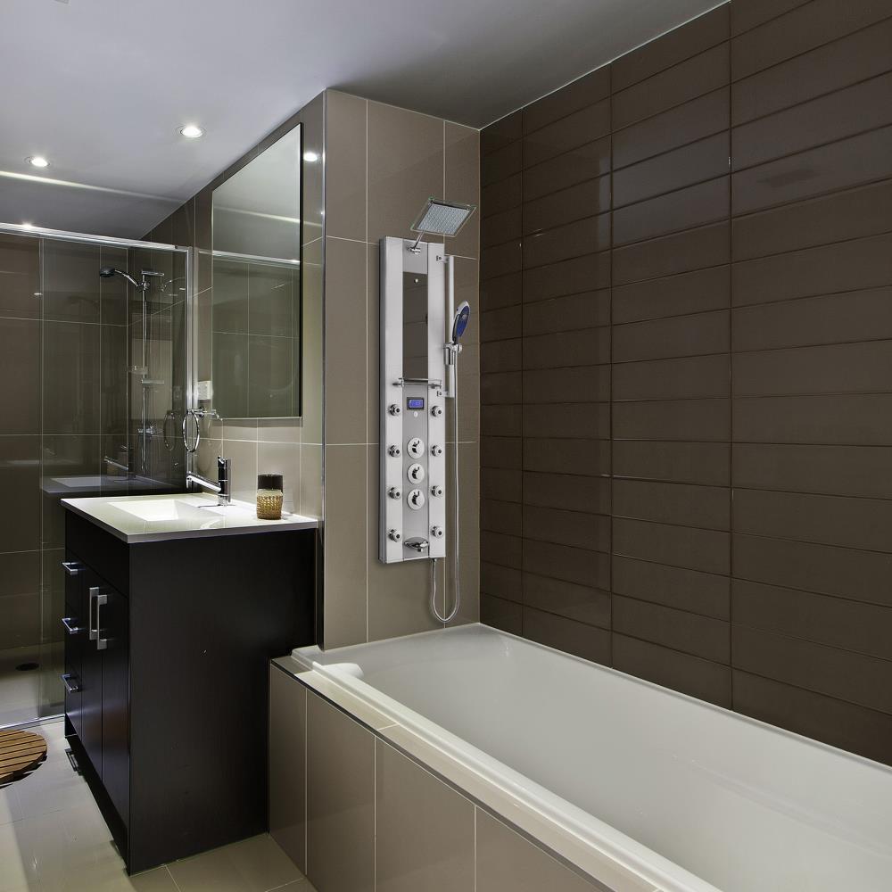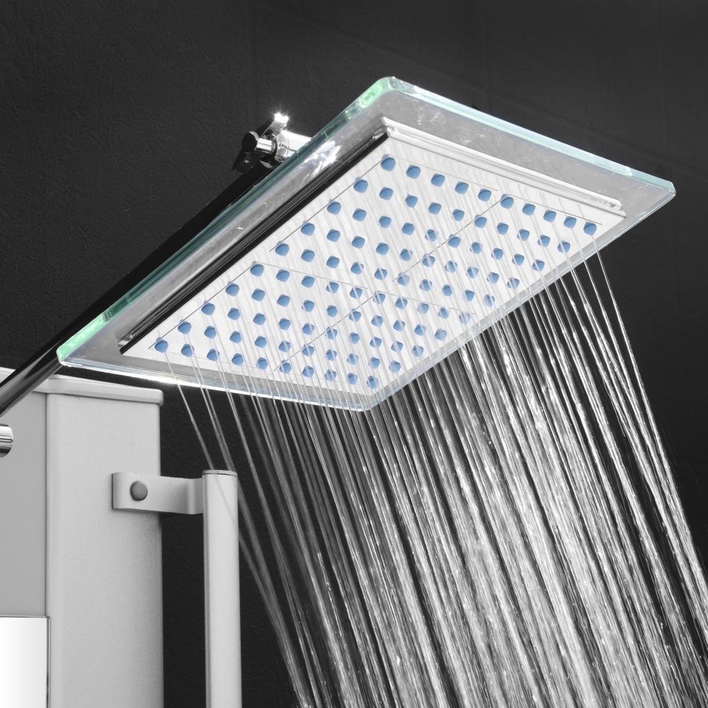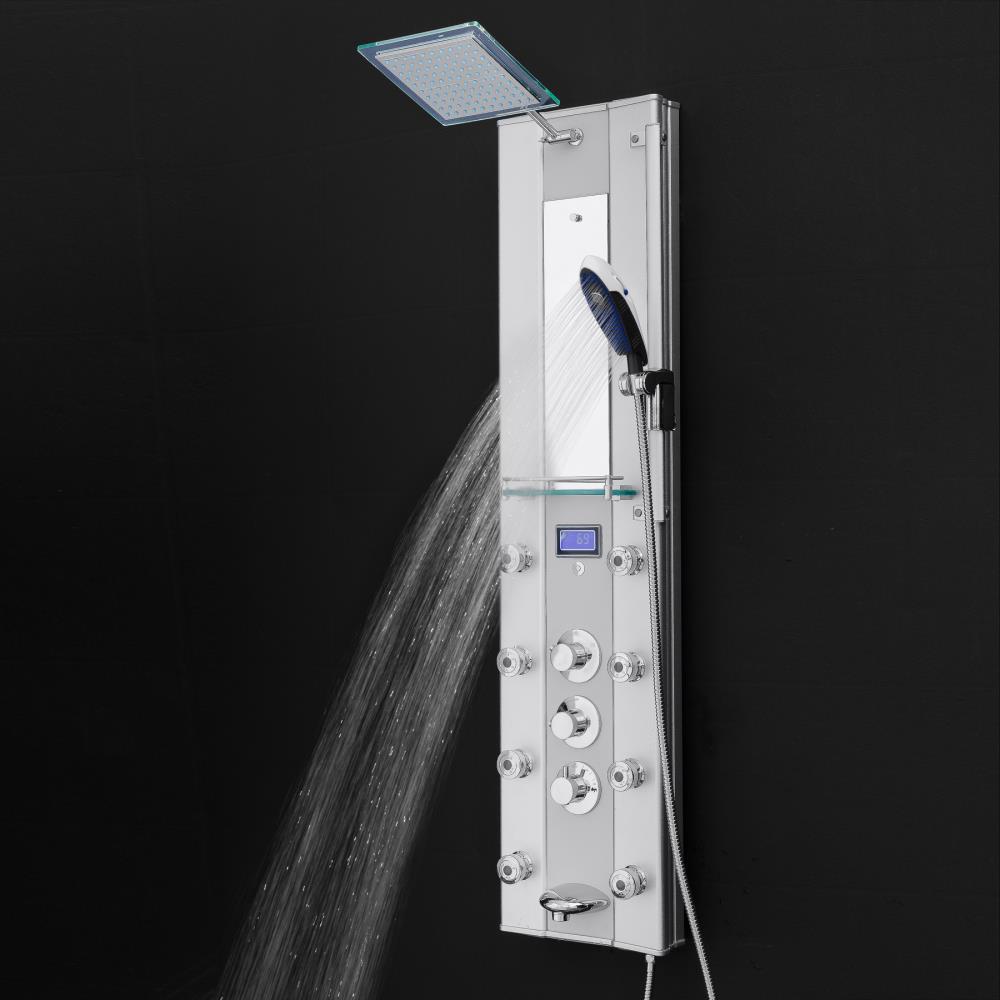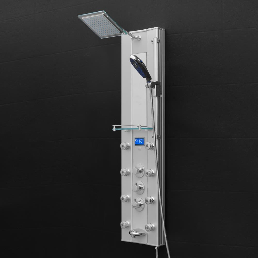 This streamlined panel turns the bath into a modern sanctuary, marrying crisp aluminum lines with a luminous glass-shelf detail. The rainfall head and rhythmic body jets create a layered, indulgent experience that feels bespoke. Style it against deep, tonal tile to let the chrome accents sparkle, and add plush towels for a spa-ready vignette. A chic essential for everyday luxury.