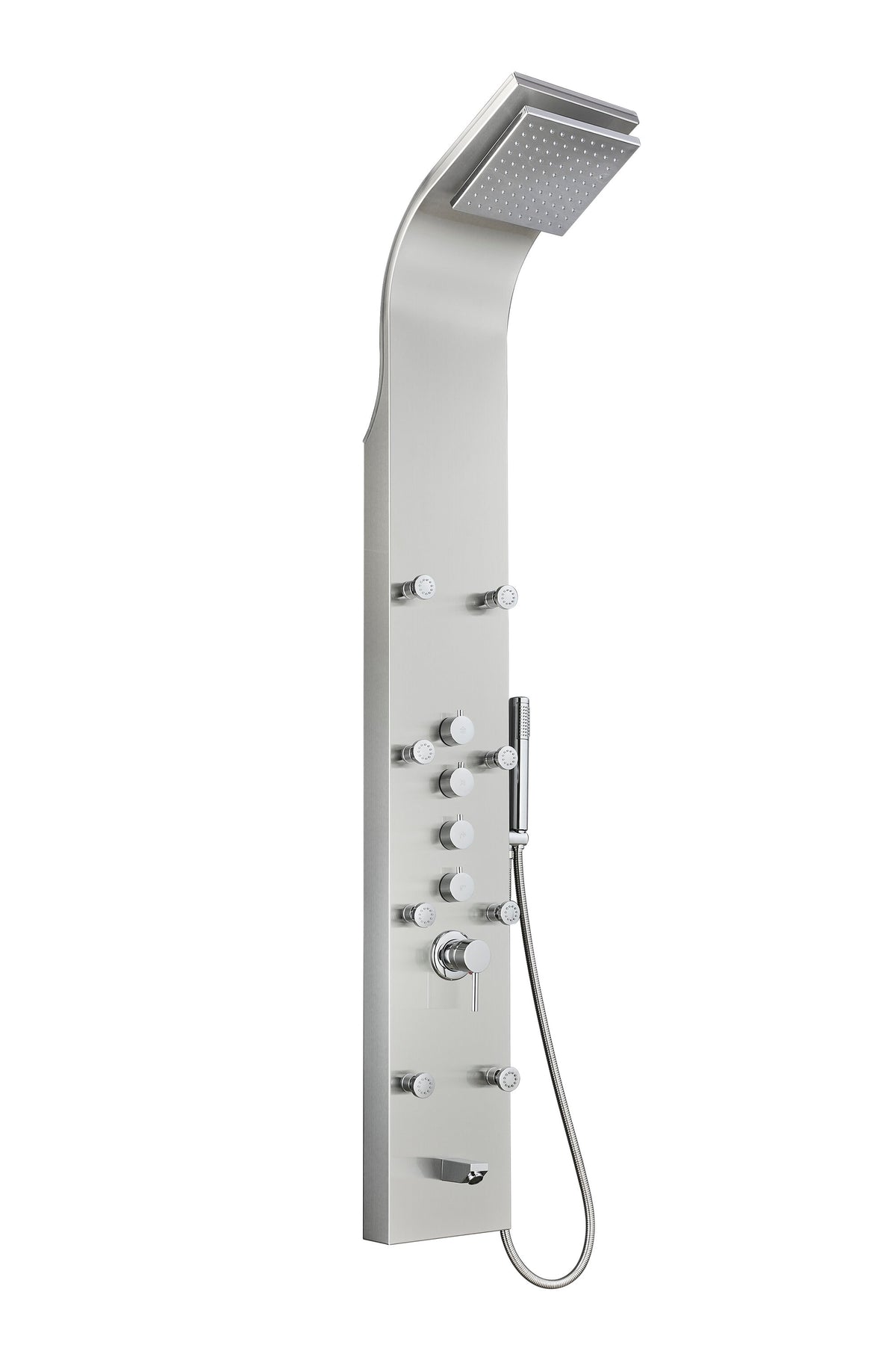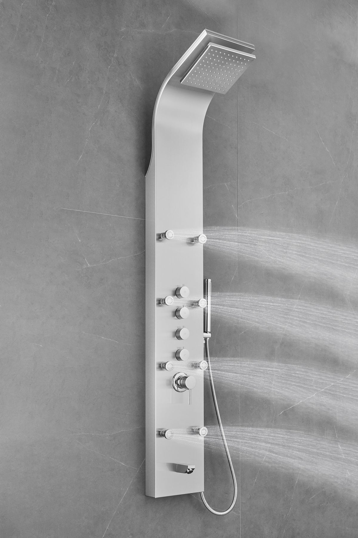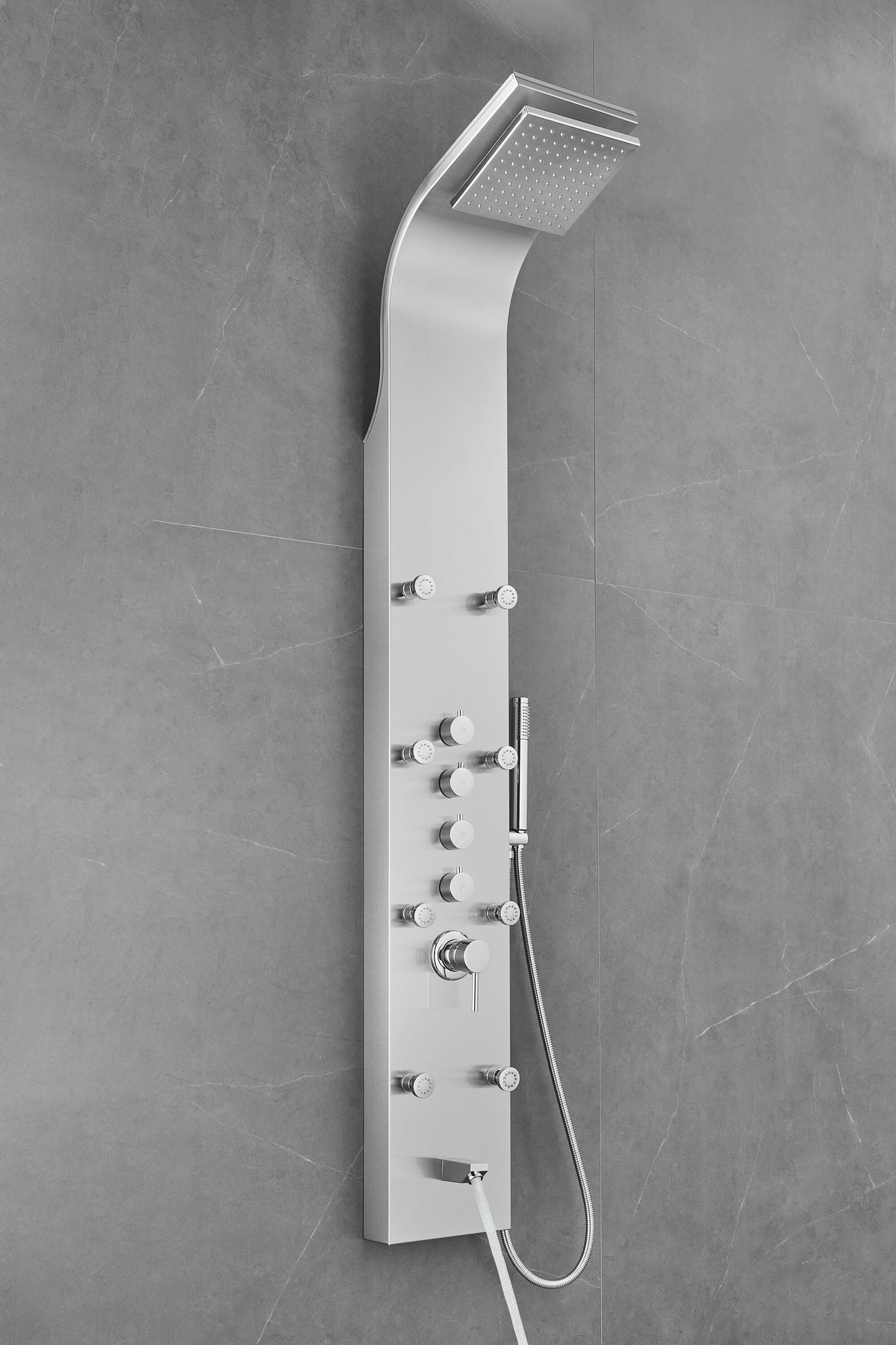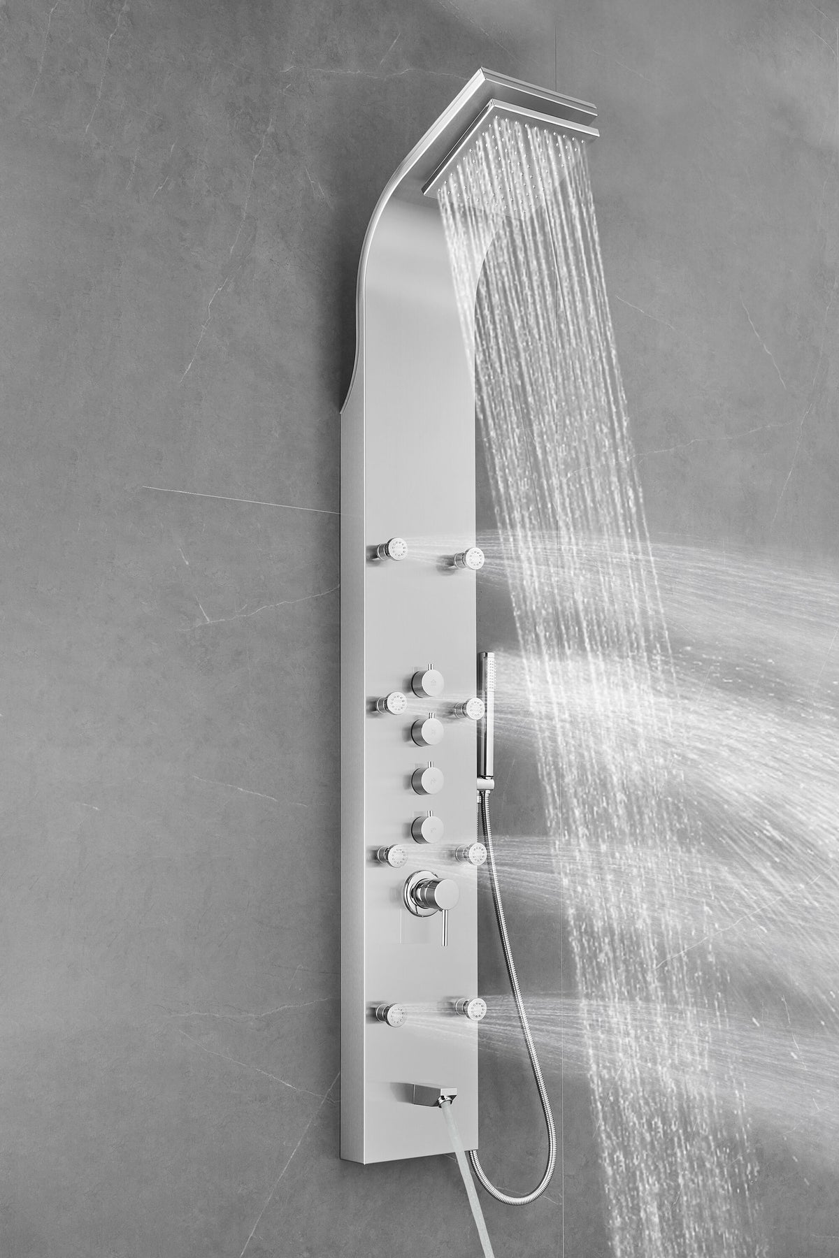Upgrade your bath with AKDY’s 65-in brushed stainless steel shower panel. It combines a rainfall/waterfall overhead head, 8 body spray jets, and a handheld wand with a built-in pressure-balancing valve for a spa-like experience and reliable performance.