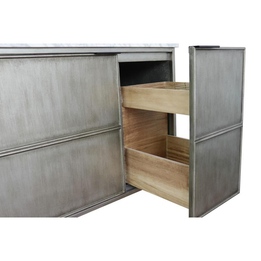 Top drawer is equipped with glass divider inserts and a circle cut-out for storing a hair dryer