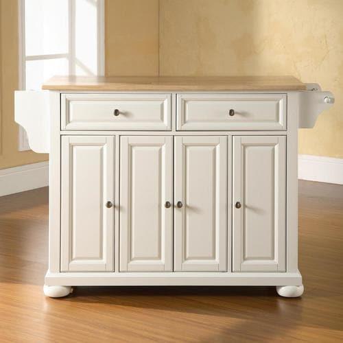 Raised panel doors conceal adjustable inner shelving that allows for effortless organizing The countertop is perfect for food prep or entertaining guests, while the attached spice rack and convenient utility drawers keep things close at hand Includes cart, counter top, stationary feet, and optional casters for convenience Features 2 deep drawers, 4 doors, 3 adjustable inner shelves, and a spice rack with towel bar