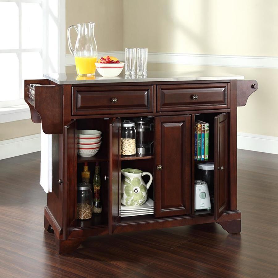 Raised panel doors conceal adjustable inner shelving that allows for effortless organizing The countertop is perfect for food prep or entertaining guests, while the attached spice rack and convenient utility drawers keep things close at hand Includes cart, counter top, stationary feet, and optional casters for convenience Features 2 deep drawers, 4 doors, 3 adjustable inner shelves, and a spice rack with towel bar