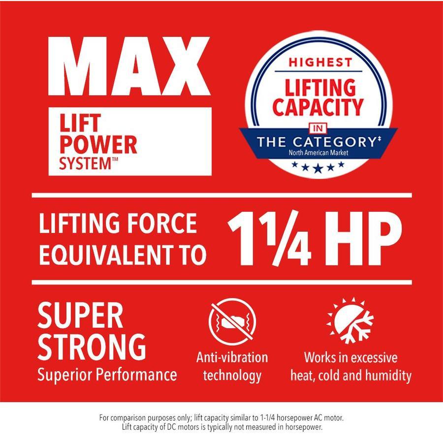 Powered by Chamberlain’s max lift power system™, the C870 delivers lifting force equivalent to 1-1/4 HP, the highest lifting capacity in the category for superior performance in extreme conditions