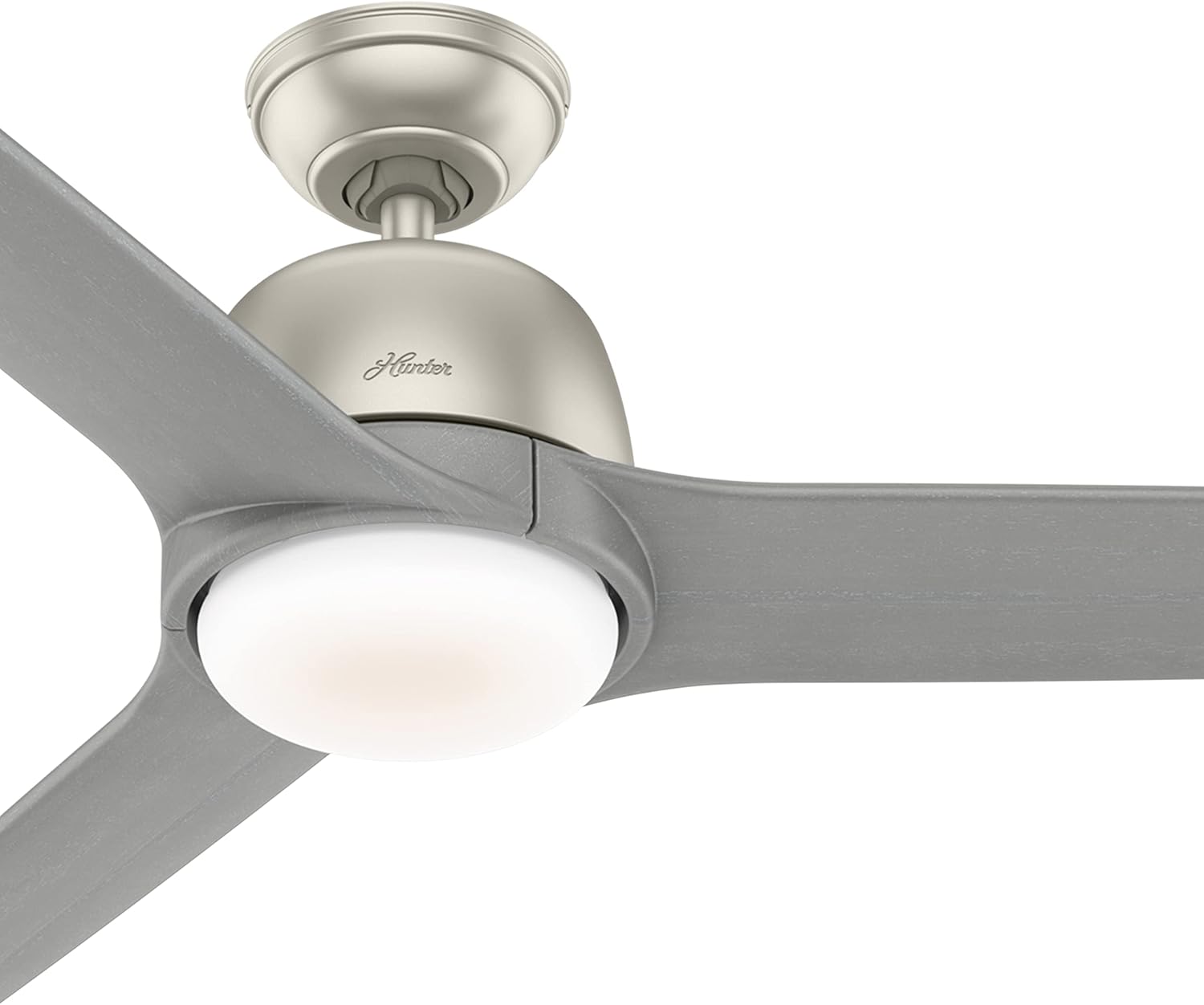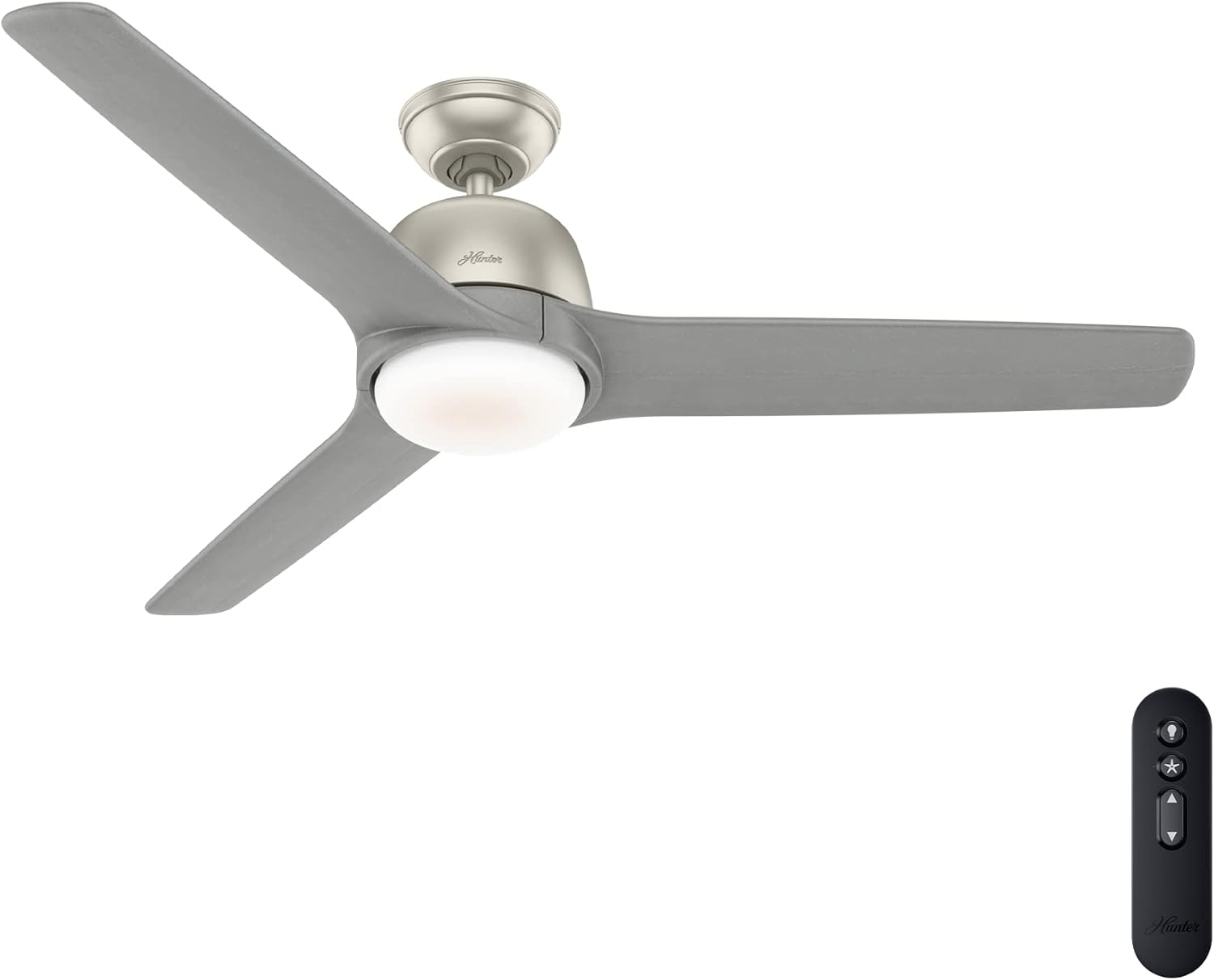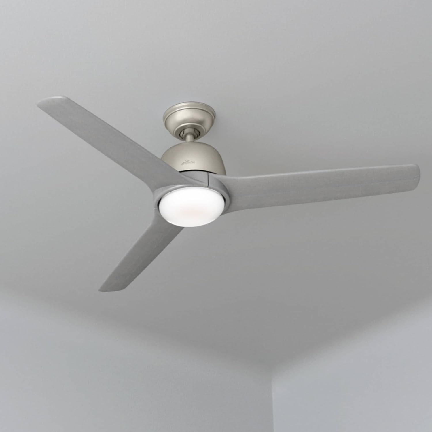 Sleek and modern, the Hunter Advocate brings smart comfort to large rooms with a quiet 6-speed DC motor and WiFi-enabled control. Its matte nickel finish pairs with integrated dimmable LED lighting and a handheld remote for effortless speed, light, and direction changes.