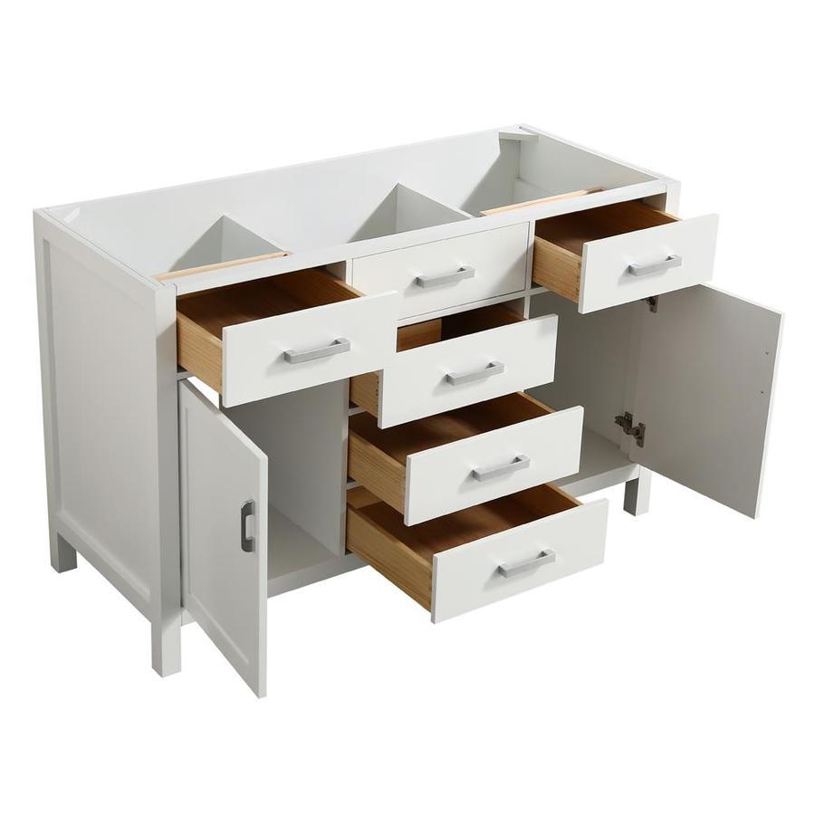 54 in. W x 21.5 in. D x 34.5 in. H Solid wood frame with MDF panels White painted finish 2 soft-closing doors with adjustable hinges so you'll never have to worry about hearing a door slam 5 soft-closing drawers with under-mount drawer glides to meet all your storage needs and 1 decorative faux drawer to complete the look Dove-tail construction drawer boxes for additional strength and stability Polished chrome finish hardware included Open back for easier installation Included: fully assembled base cabinet, hardware