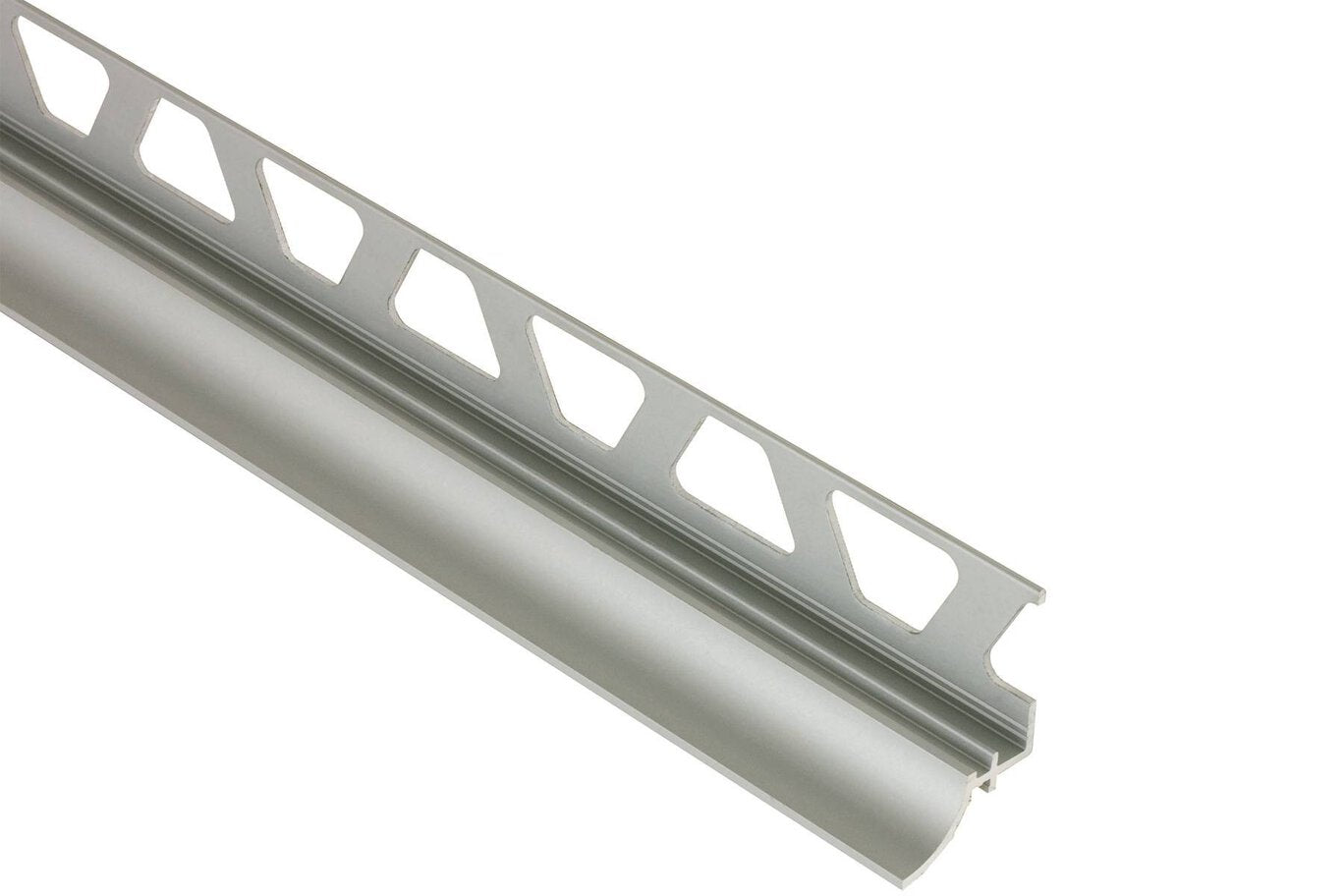 Anodized, color-coated aluminum cove-shaped profile for clean, sanitary transitions between tiled walls and finished floors. Eliminates caulking at wall-to-floor junctions while preventing water penetration and dirt buildup with a 3/8 in (10 mm) radius.