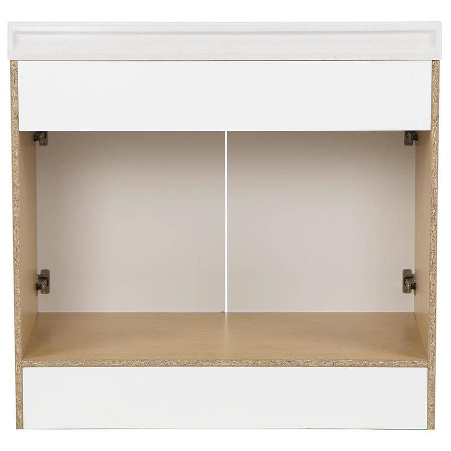 A clean, traditional vanity combo featuring a white painted cabinet and an integrated cultured marble top with oval sink. Fully assembled with brushed nickel hardware, it offers practical storage and a compact 18.6-in depth ideal for standard bathrooms.