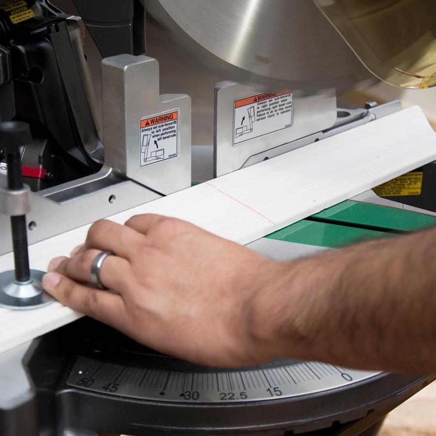 FENCE: Tall, pivoting aluminum fence that stands at a height of 5-1/8 In. allows crown molding to be cut vertically