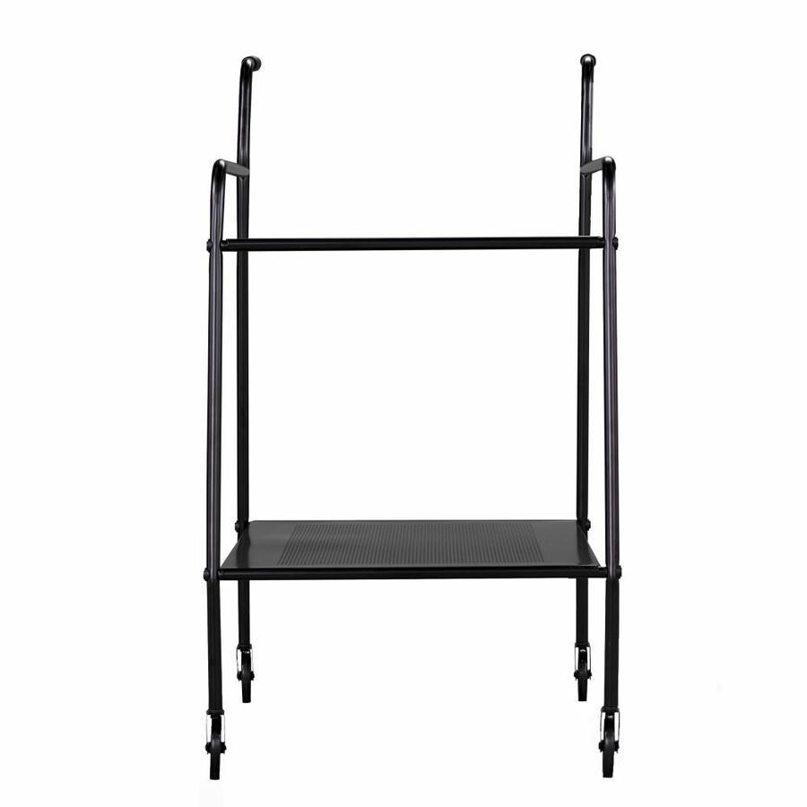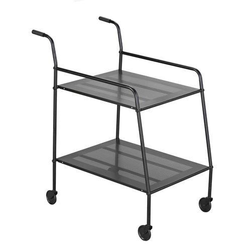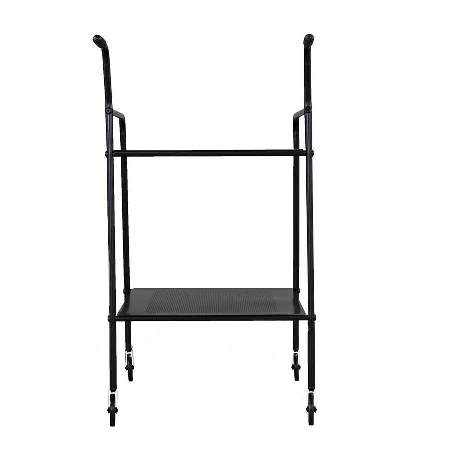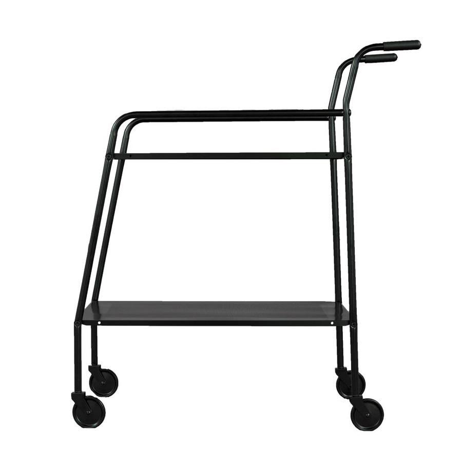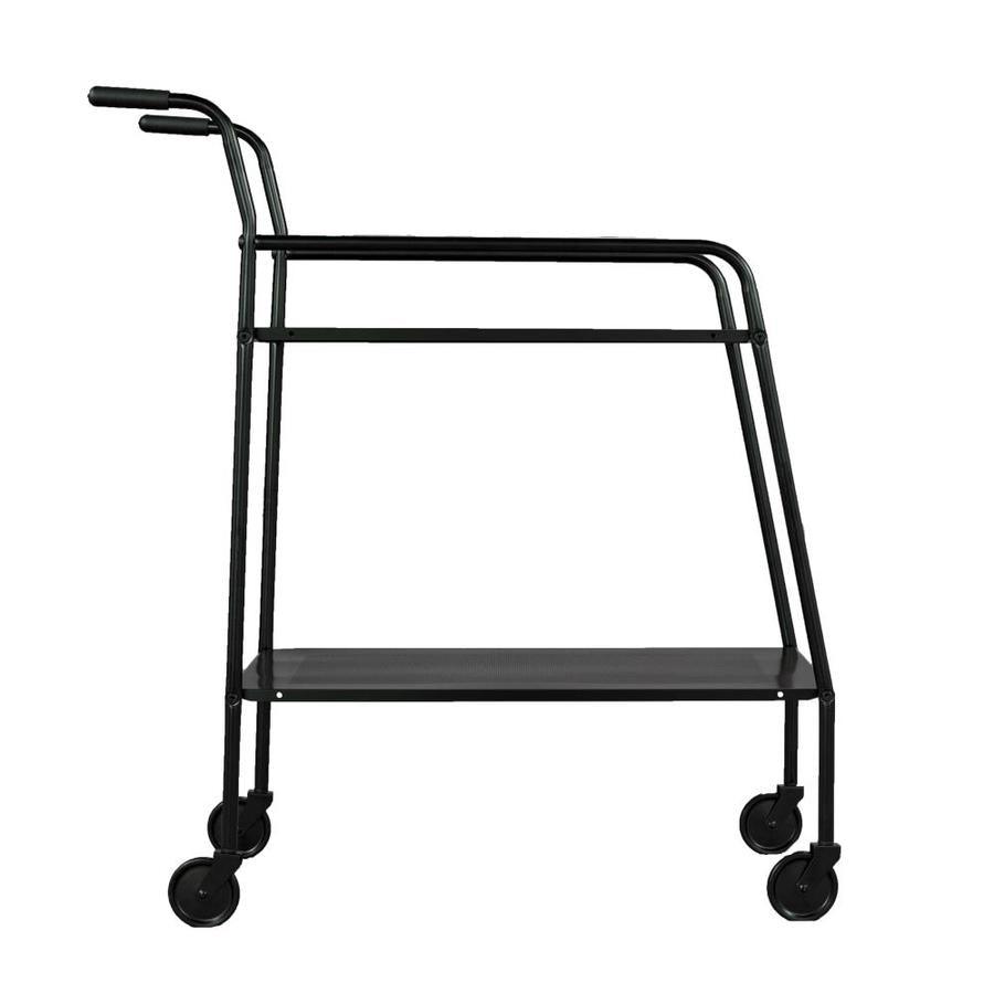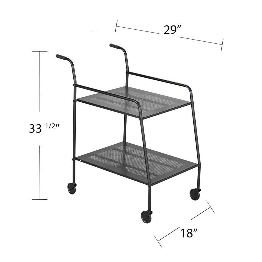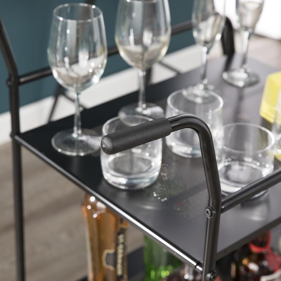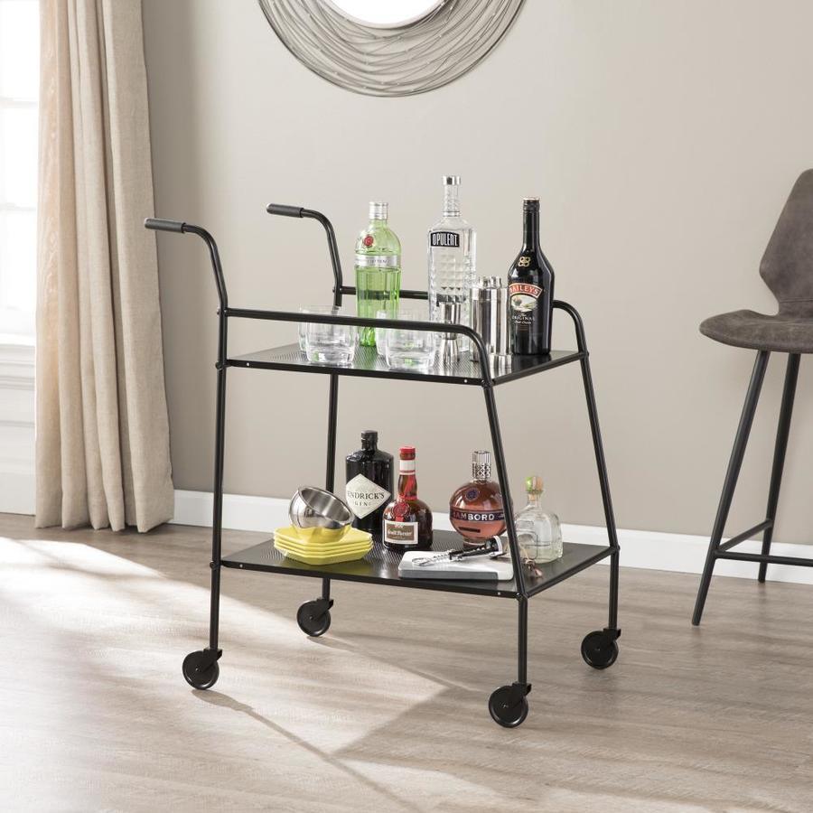 Metal bar cart of the Howe collection has minimalist design Black finish Powder-coated iron Sleek snack cart Contemporary, minimalist style Rectangle Wheels for easy transportation Easy to assemble