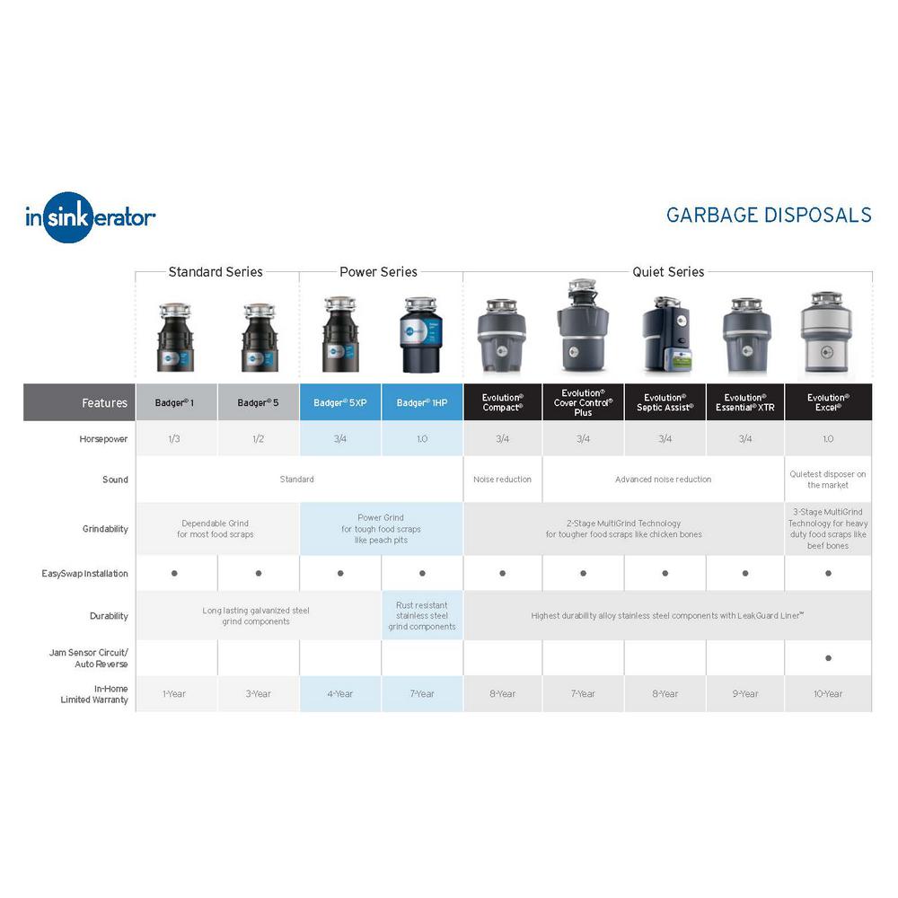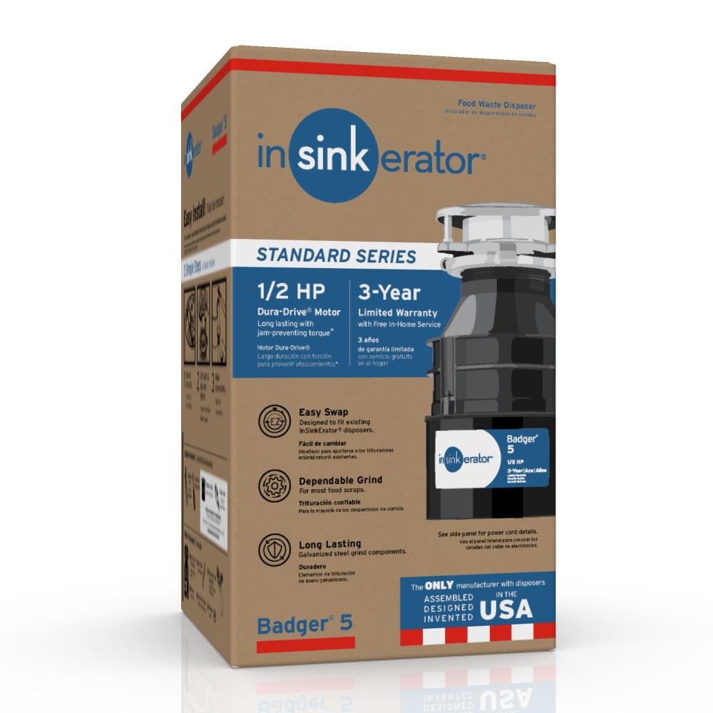 The InSinkErator Badger 5 1/2 HP Continuous Feed Garbage Disposal features a quick-mounting system that allows for easy installation or replacement of most disposers. This garbage disposal also features a 1/2 HP motor that rapidly grinds food waste for easy rinsing down the drain. The garbage Disposal also features galvanized steel construction for durability.