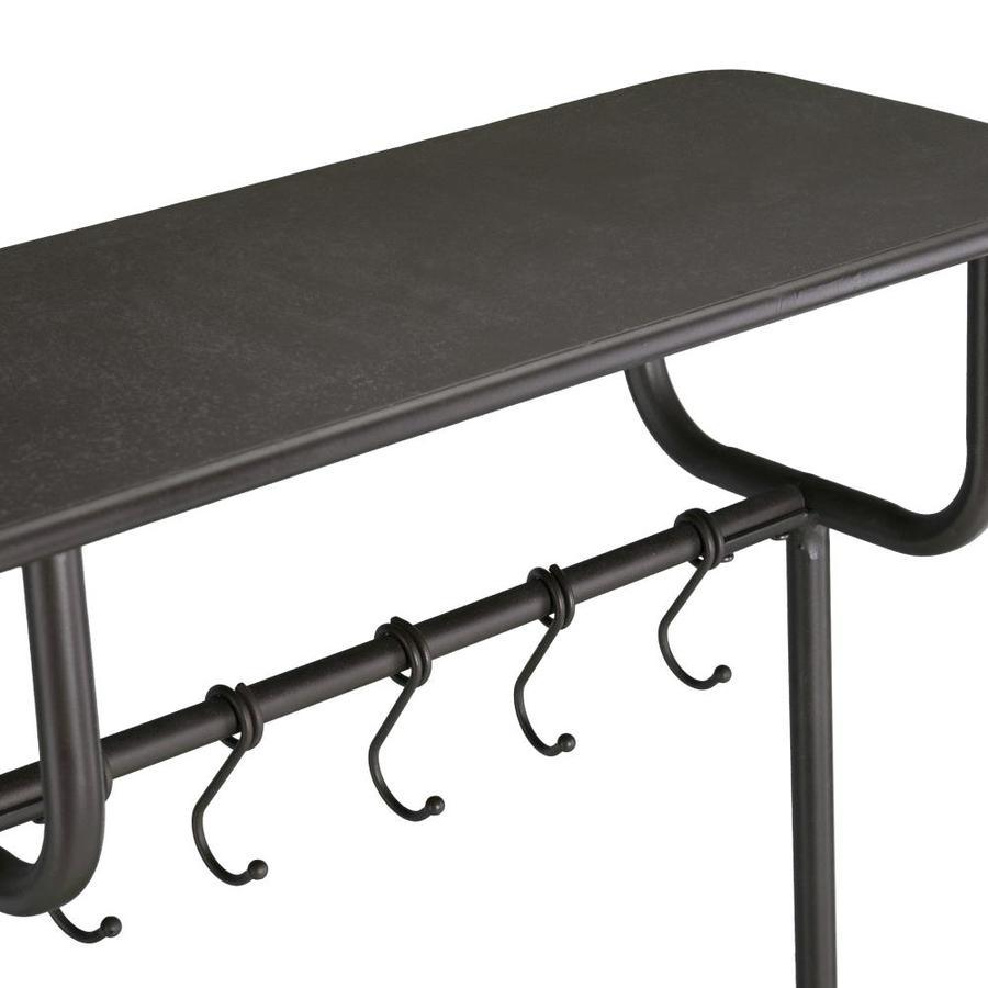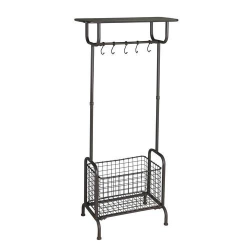 Entryway storage rack of the Rengo collection has a grab-and-go storage capacity Rustic brown Materials: powder-coated, brushed iron sheet, iron tube, iron line 5 Ball-tipped hooks, 1 shelf, and 1 removable basket Farmhouse inspired industrial style Hooks are mobile on coat rack Goes anywhere slim profile