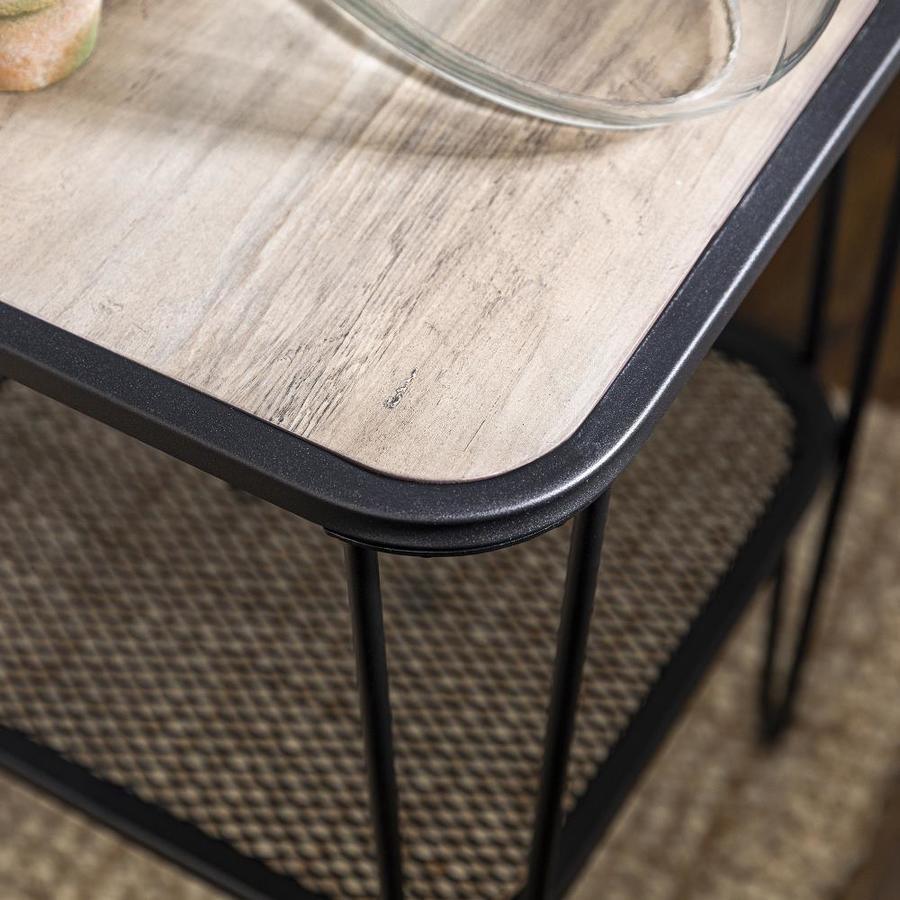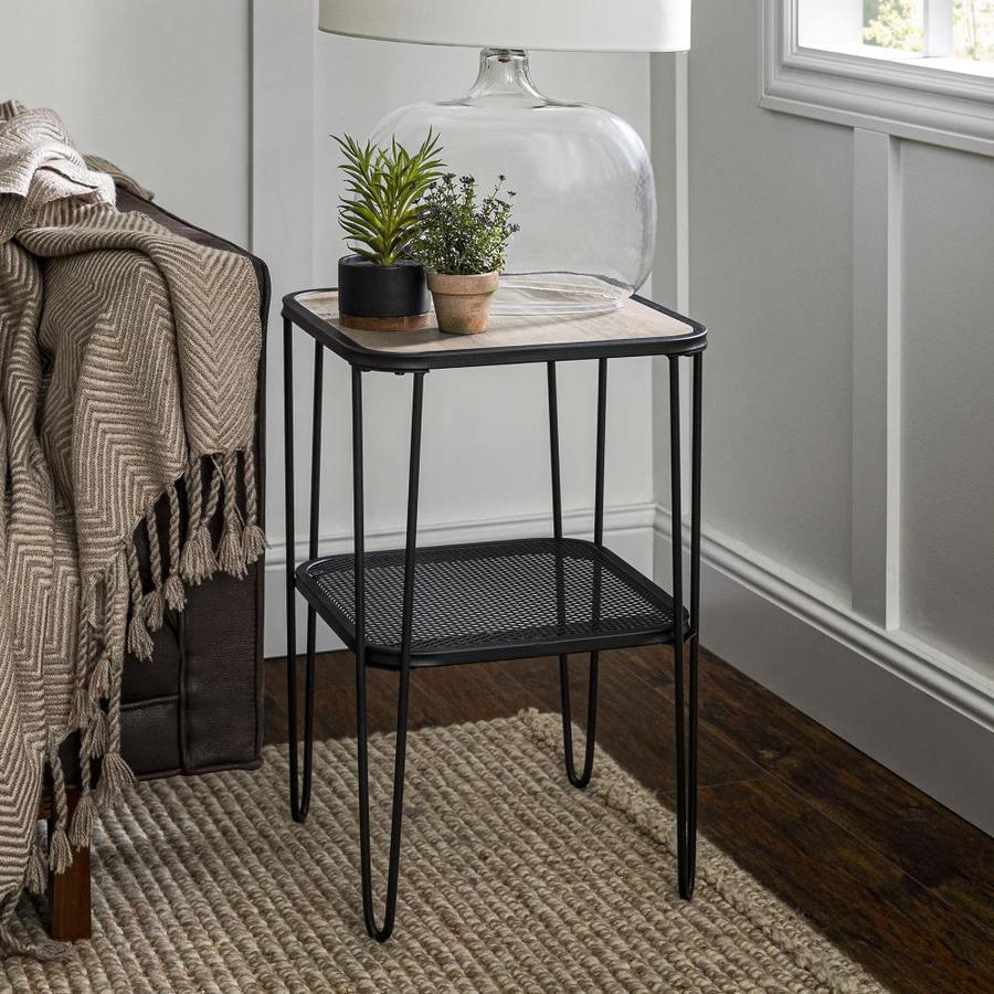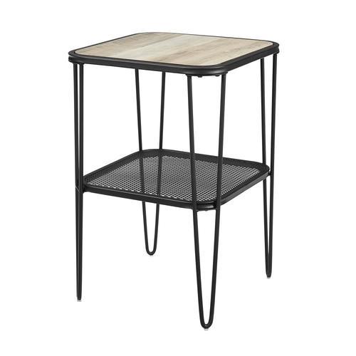 Use as a nightstand, end table, or accent table Mid-century modern inspired hairpin legs Metal mesh lower shelf Square side table with open storage Urban industrial mixed material side stand Ships ready-to-assemble with step-by-step instructions