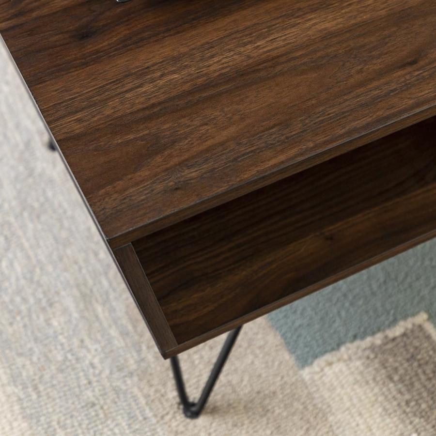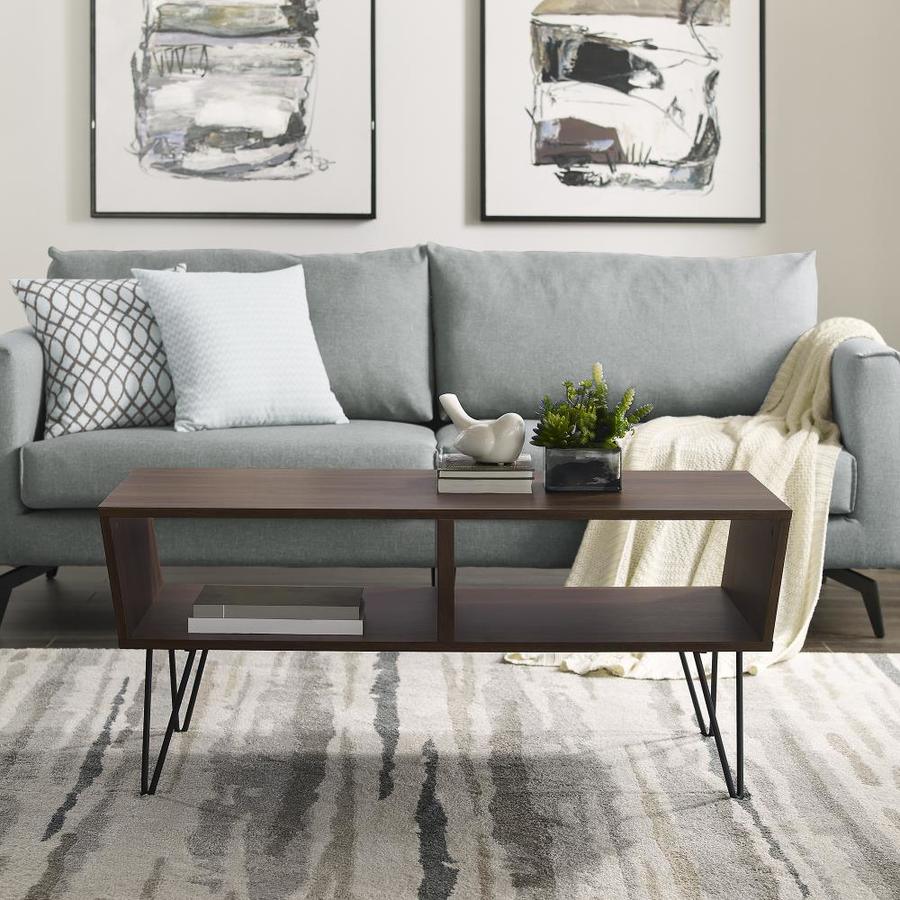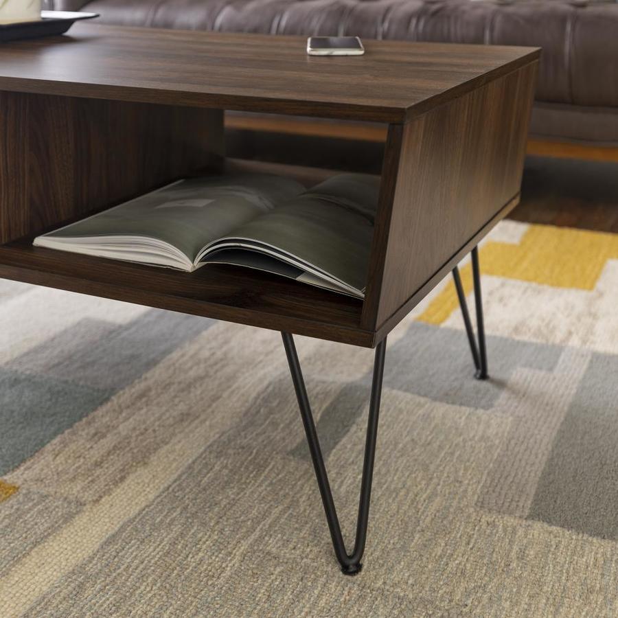 Made with angled sides for a mid century modern style With hairpin style legs that look unique The table is made of high-grade MDF with laminate in a wood grain texture Features two open shelves for storage space This coffee table offers storage space while looking stylish in your living room Ships ready-to-assemble with step-by-step instructions