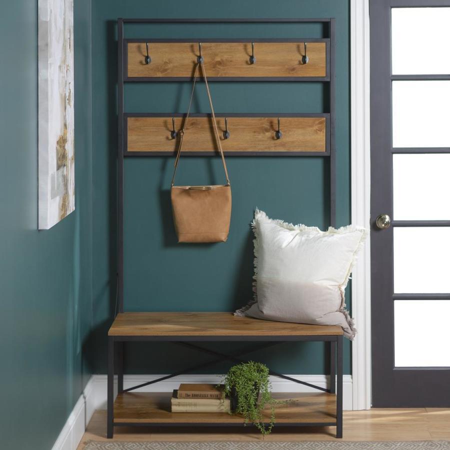 Designed to add an industrial style in your entryway, mudroom, or hallway Made of high-grade MDF and with a powder-coated metal frame With seven hangers to hang clothing and bags With an open bottom shelf for storage and perfect for shoes Bench included to sit on or keep your bags Ships ready-to-assemble with step-by-step instructions