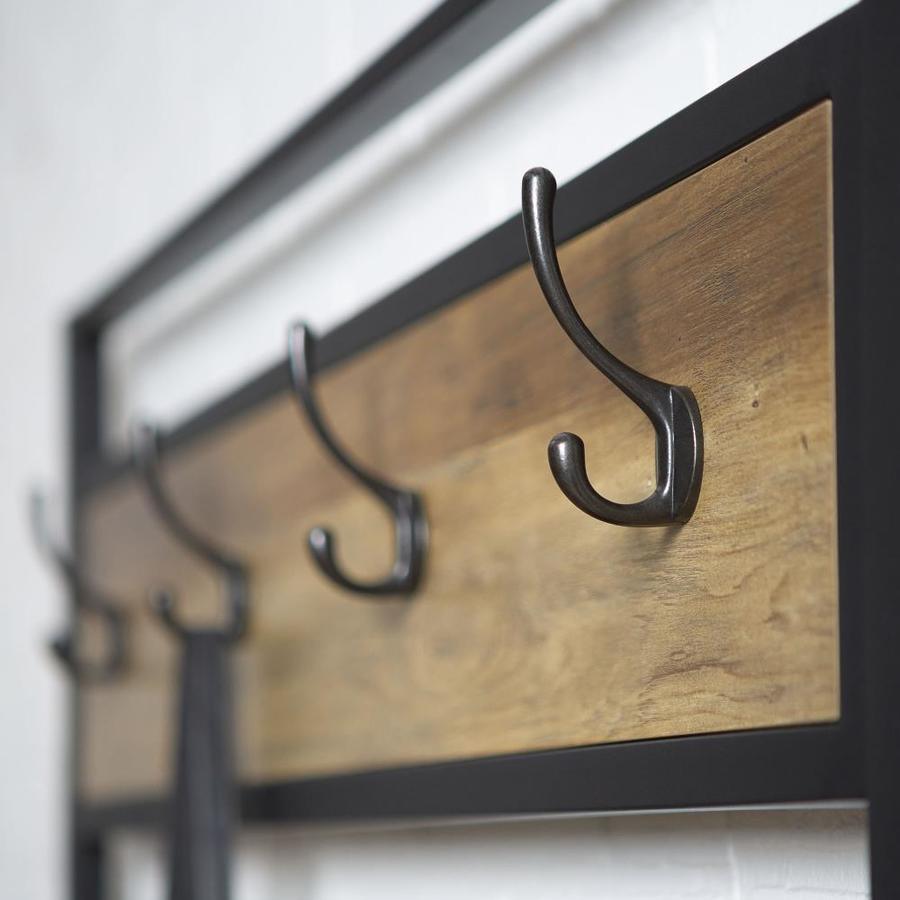Designed to add an industrial style in your entryway, mudroom, or hallway Made of high-grade MDF and with a powder-coated metal frame With seven hangers to hang clothing and bags With an open bottom shelf for storage and perfect for shoes Bench included to sit on or keep your bags Ships ready-to-assemble with step-by-step instructions