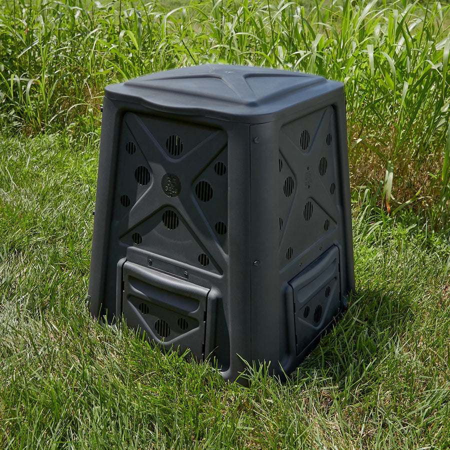 Heavy-duty polypropylene with a 65-gal capacity retains heat and moisture, so you compost more efficiently