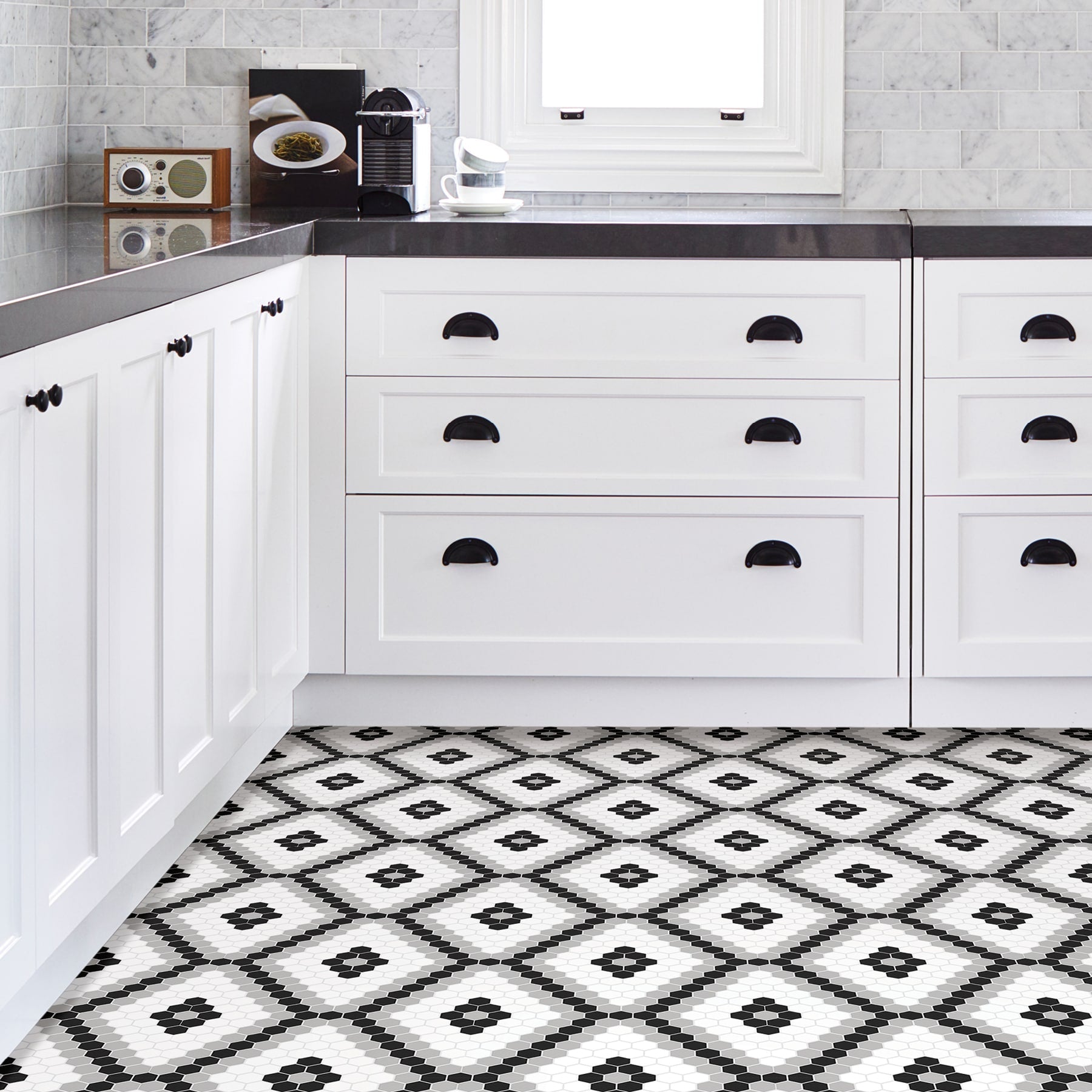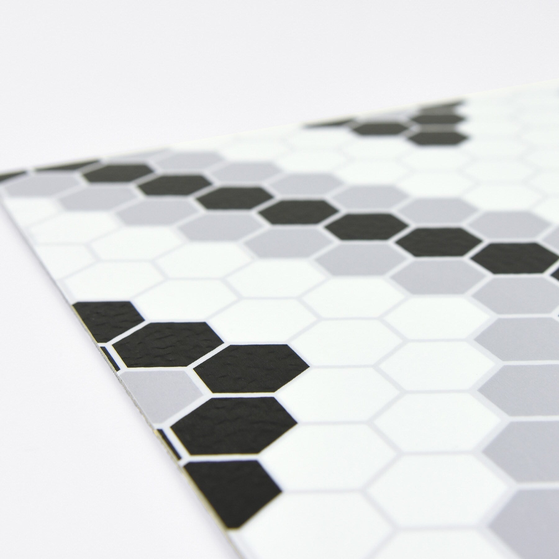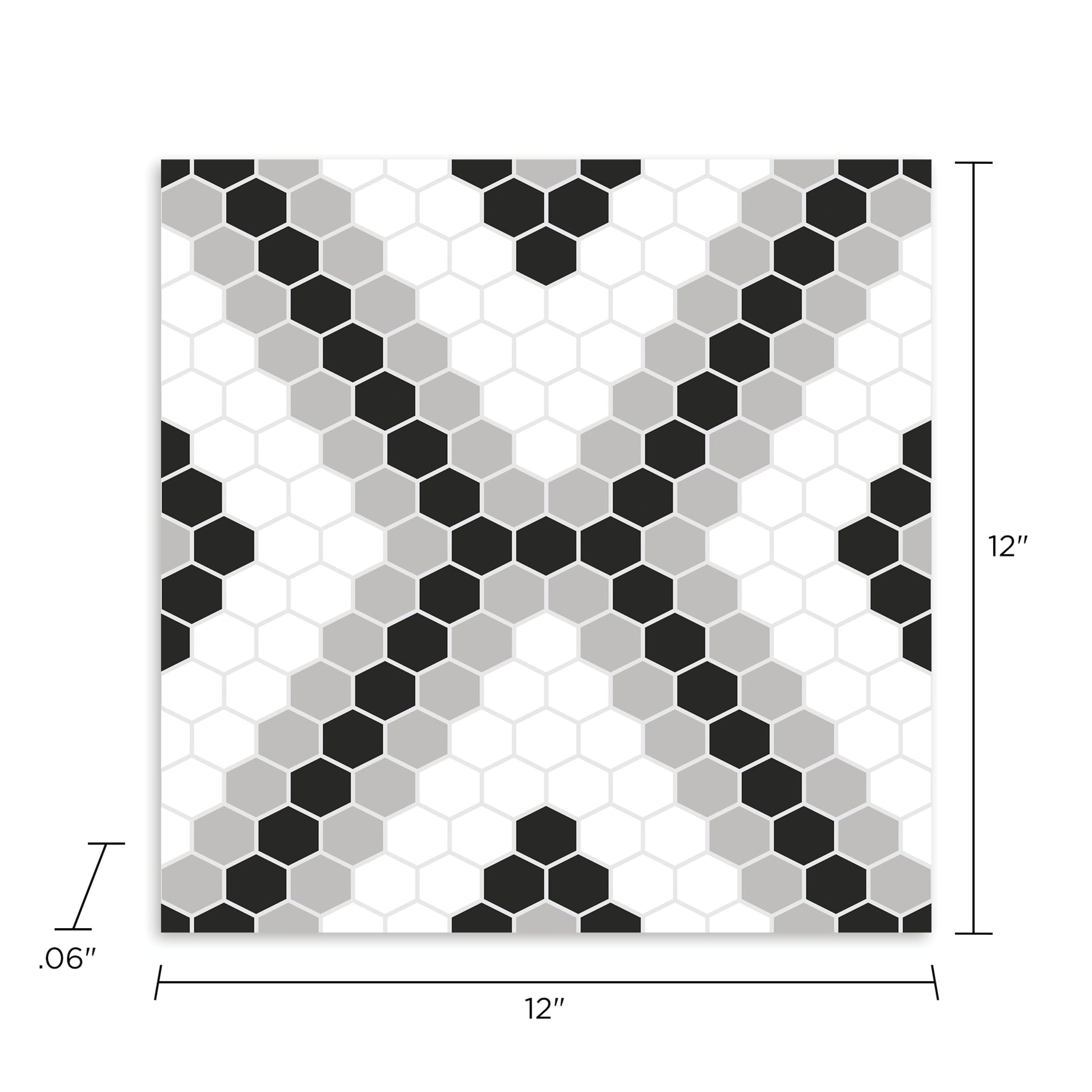 Timeless black-and-white patterned peel-and-stick vinyl tiles for quick DIY floor refreshes. Each 12-in x 12-in tile installs without grout or special tools, offering water resistance and easy cleaning. Durable virgin vinyl with a textured, low-lustre finish and permanent adhesive.