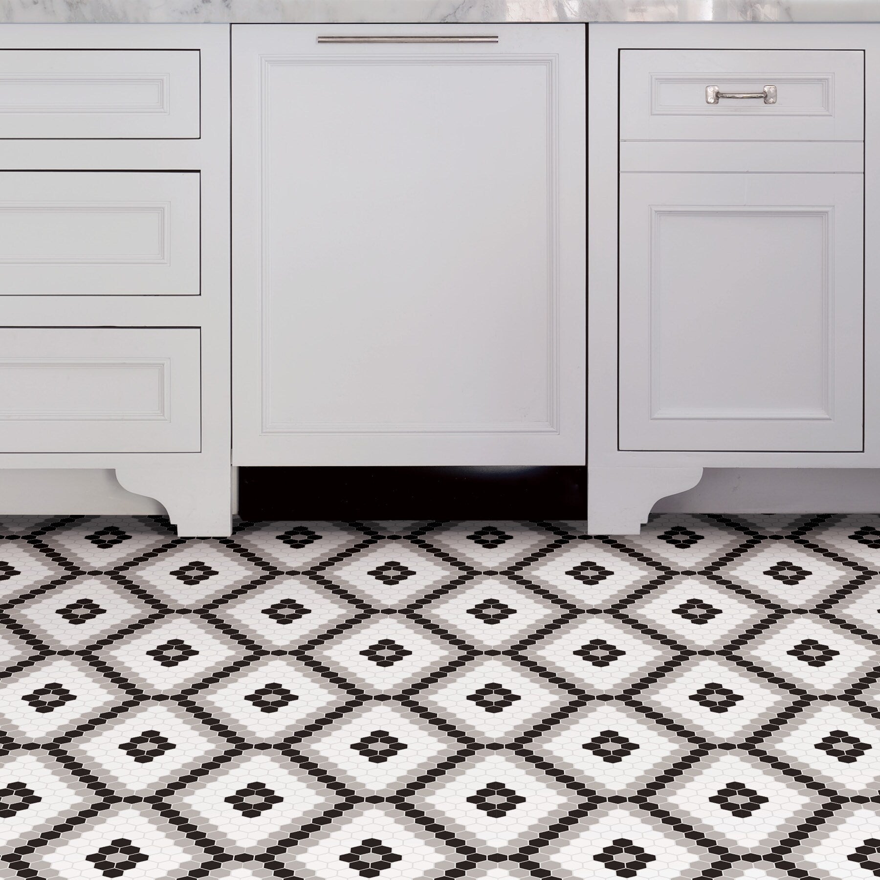 Leyton’s black-and-white mosaic pattern brings crisp geometry and tailored charm to any room. The subtle texture and low-lustre finish add depth while keeping the look refined. Style it with clean-lined cabinetry and brushed nickel hardware to let the graphic floor sing. An effortless upgrade that whispers luxury with every step.