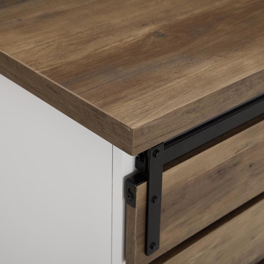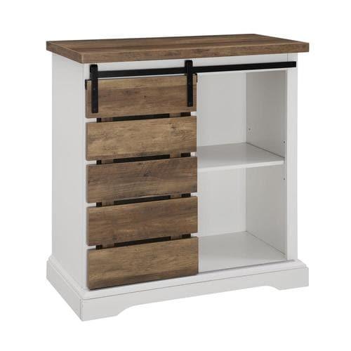 With a rustic, modern farmhouse design style for a charming country feel Made of high-grade MDF, durable laminate, and metal With a sliding door to cover either side of the console Including open and closed storage, adjustable shelves, and exposed hardware Perfect for your living room as a TV stand, in your bedroom as a storage console, or as a buffet in your kitchen Ships ready-to-assemble with step-by-step instructions