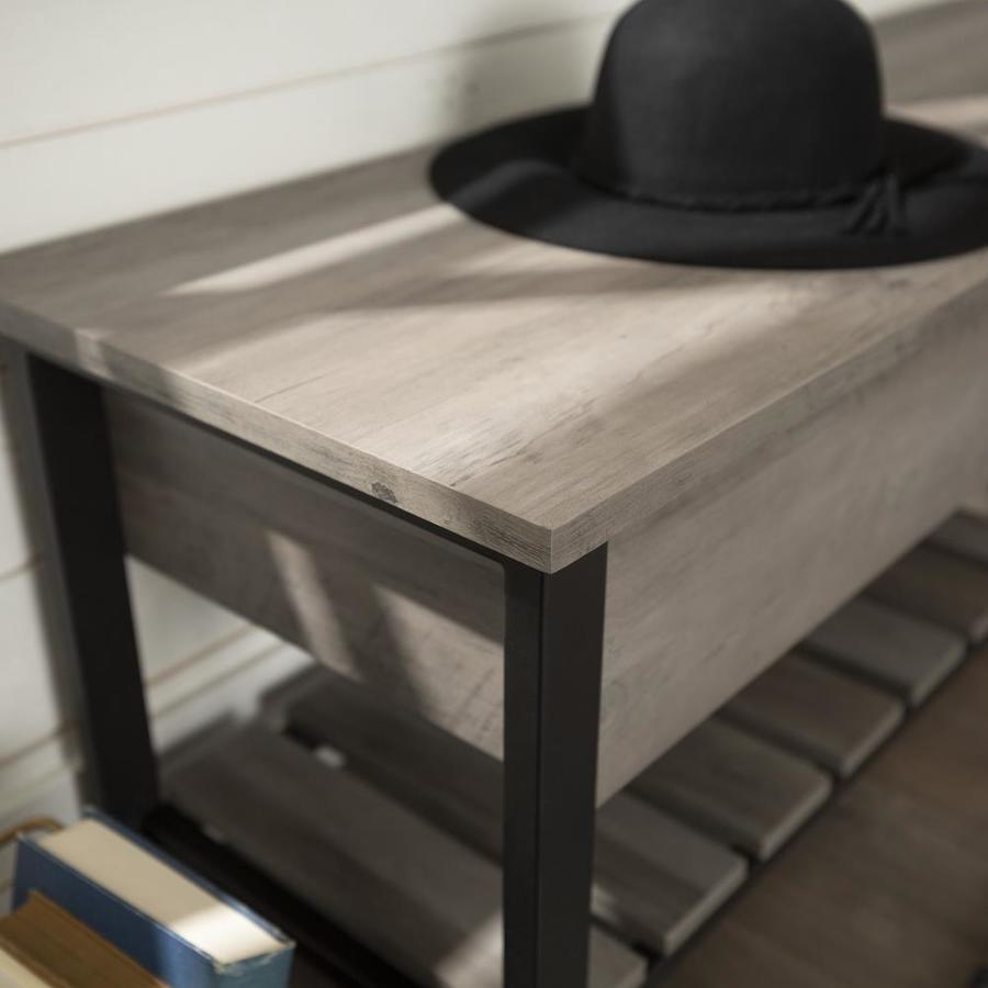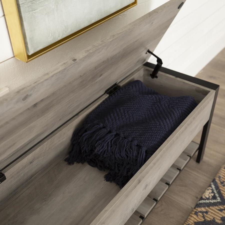 Featuring a slatted bottom shelf for shoes Having an open top as a wide storage bin Unique blend of materials for a rustic, modern farmhouse style Made from high-grade MDF and metal In a beautiful grey wash Ships ready-to-assemble with step-by-step instructions