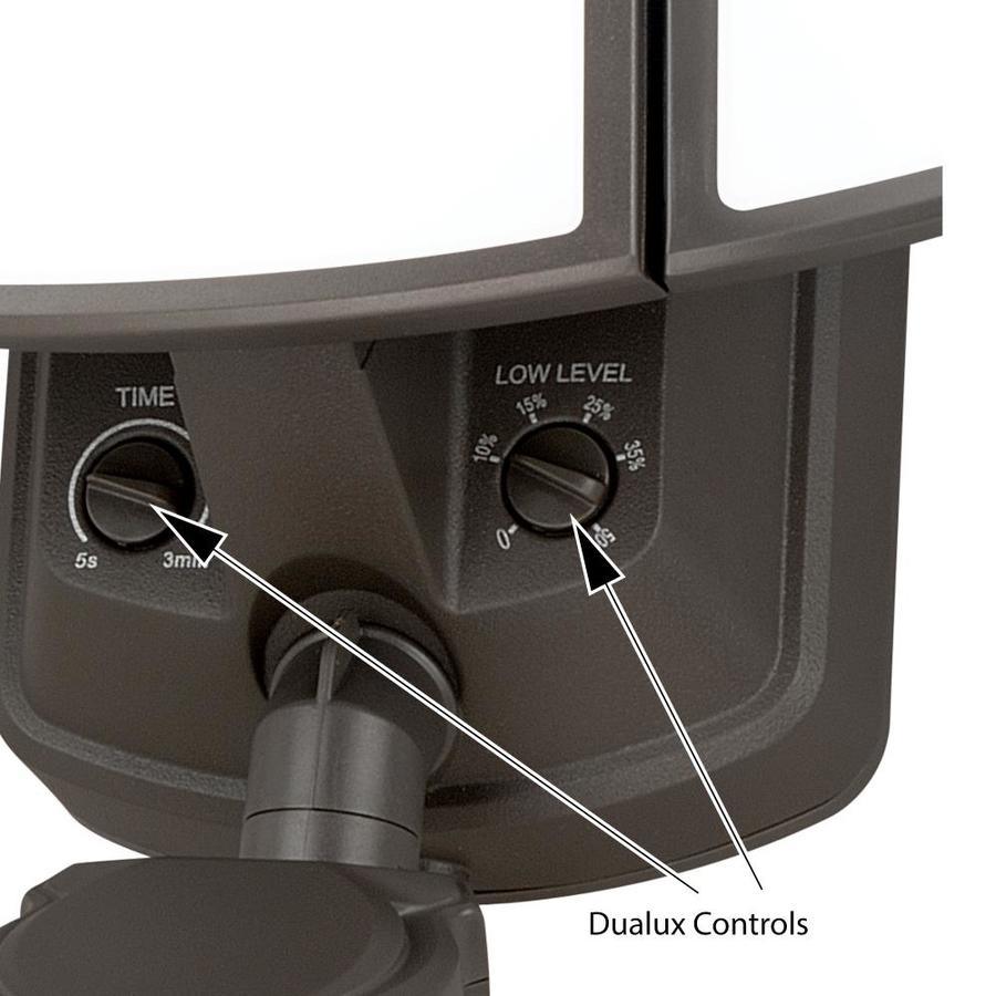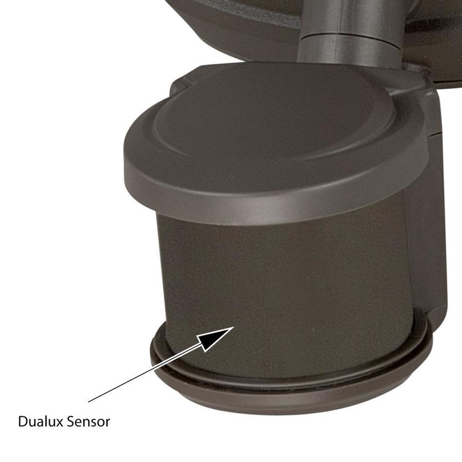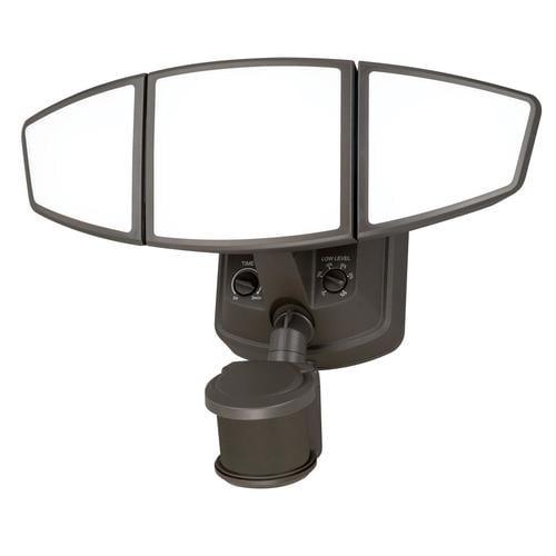 360-Degree on demand motion sensor automatically turns on when movement is detected Adjustable wide detection range up to 70 feet for maximum protection Built in dusk to dawn photocell that automatically turns the light on at dusk and turns it off at dawn, saving energy during daylight hours Convenient timer to choose duration of continuous bright light illumination for 0, 3, or 6 hours 34 watt Integrated LED bulb (included) for energy saving, no bulb changing convenience, low maintenance and long lasting performance 2600 lumens (brightness = 175 watt incandescent), 5000K CCT (daylight), CRI 80 (daylight) Ball and socket design allows for easy head rotation so you can direct light where you need it most Weather resistant and flexible mounting options; mount to wall or eave Long lasting 5 Year limited warranty for peace of mind