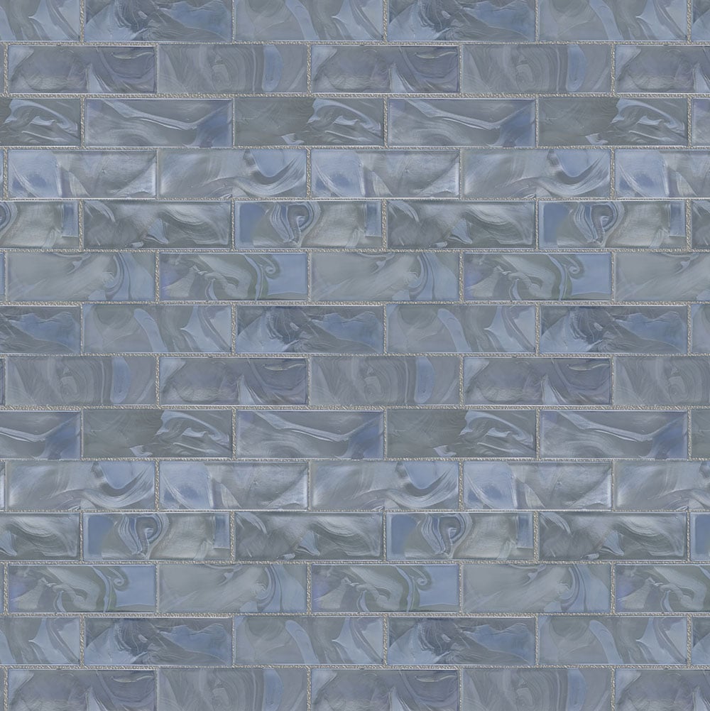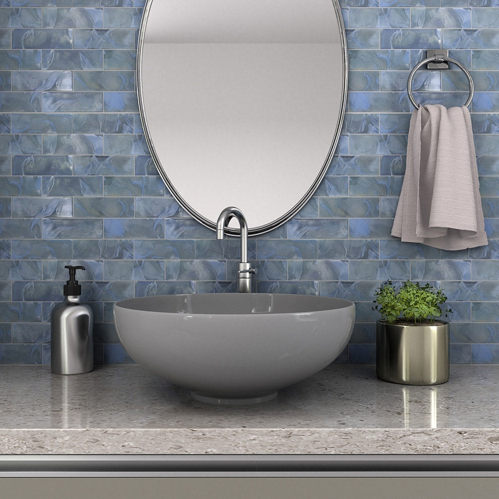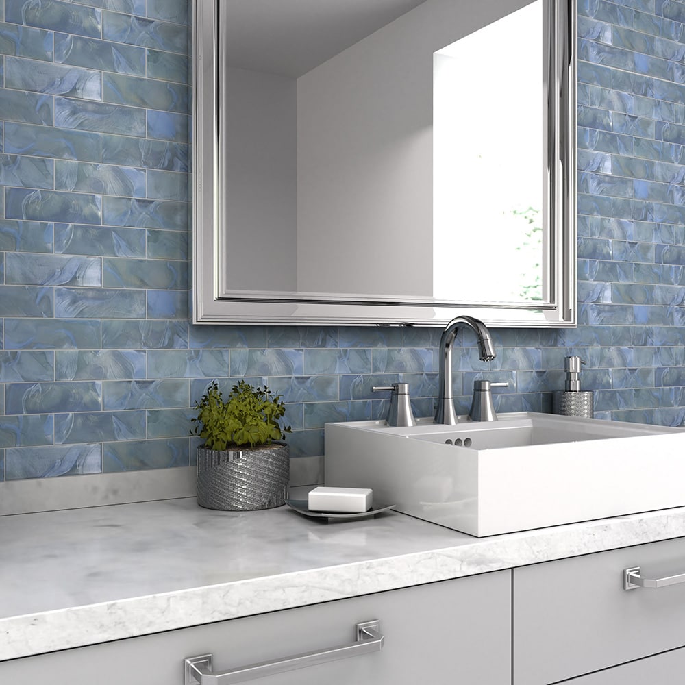Luminous Glass Finish: Glossy, translucent blue glass delivers depth and movement on walls and backsplashes.