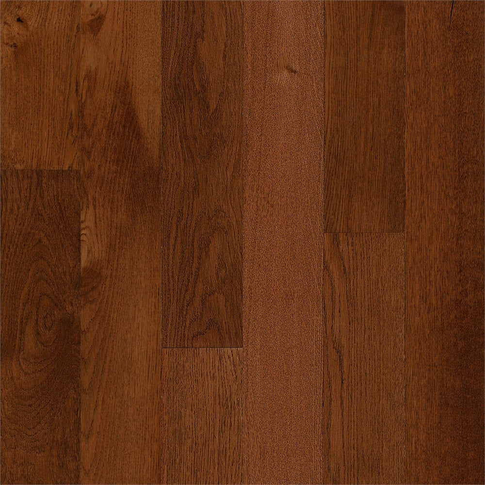 A: Real oak with a prefinished, low-gloss smooth/traditional texture in the Saddle color.