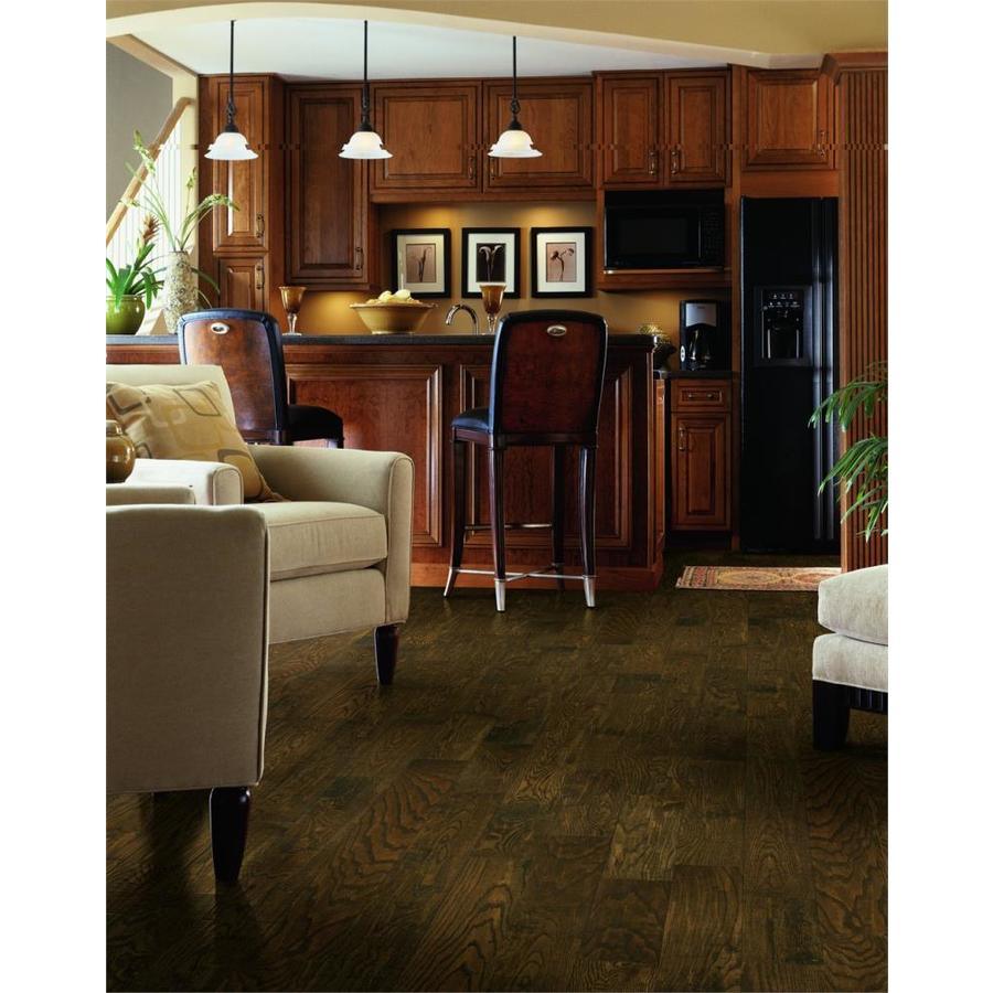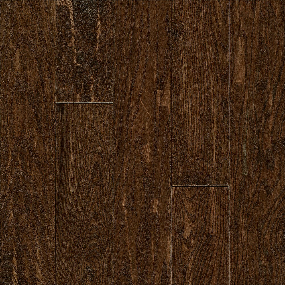 Sample a high-gloss, prefinished solid oak plank from Bruce’s America’s Best Choice collection. This 3/4-in thick, 5-in wide handscraped board showcases rich brown tones and authentic grain to help you preview the look before a full install.