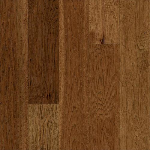 Sample of Bruce America’s Best Choice solid hickory flooring in Honey Grain, prefinished with a low-gloss urethane and aluminum-oxide finish. This 3/4-in thick, 5-in wide smooth/traditional board showcases rich Appalachian hickory tones and tongue-and-groove construction for nail-down installation.