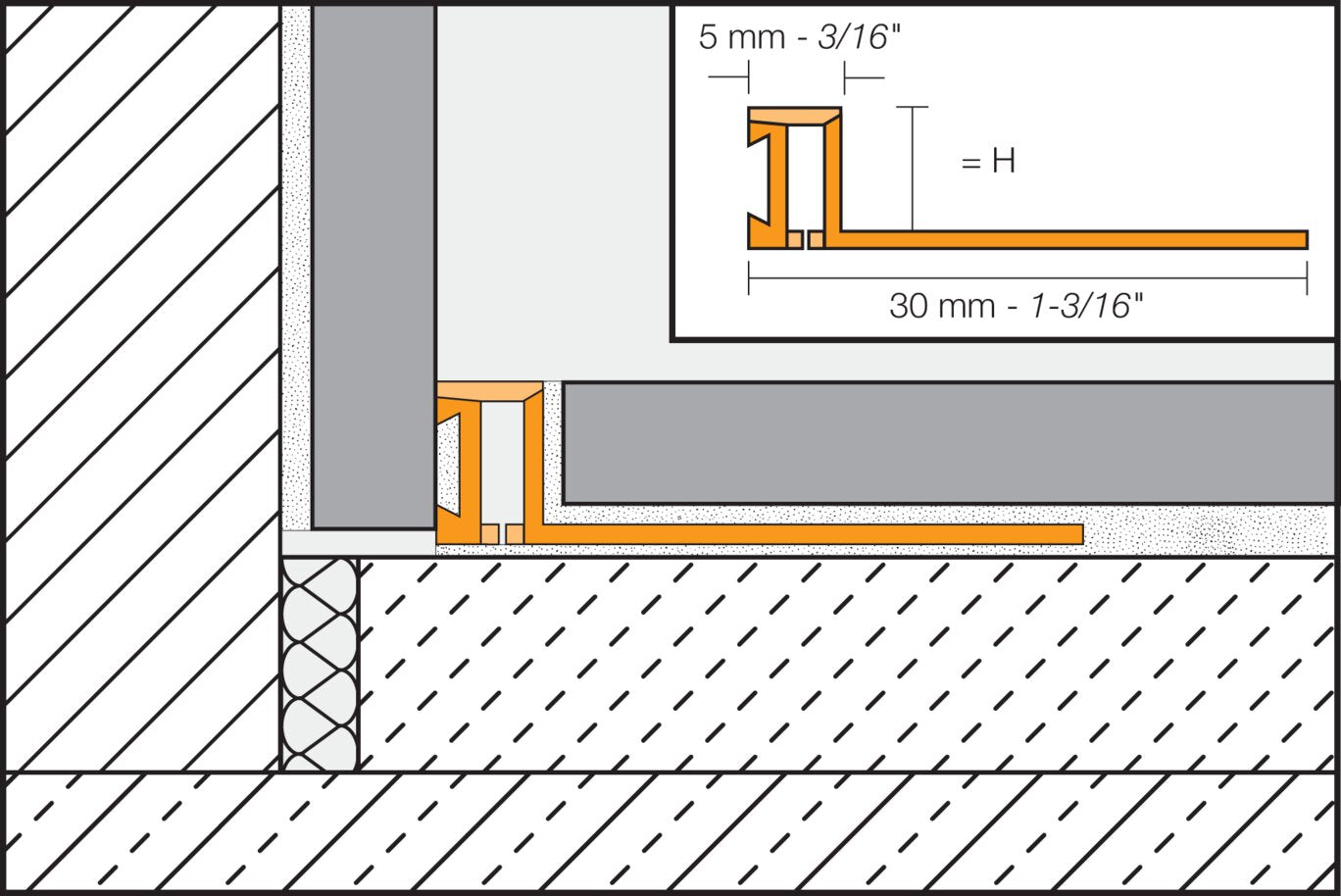 A perimeter joint profile that isolates tile coverings from fixed building elements to prevent cracking and eliminate caulking. The DILEX-BWA features a rigid PVC dovetailed channel and a movement zone available in matching grout colors, ideal for bathtubs, shower trays, backsplashes, and frames.