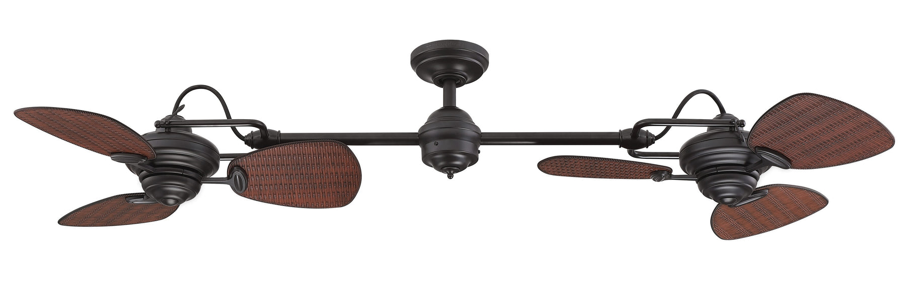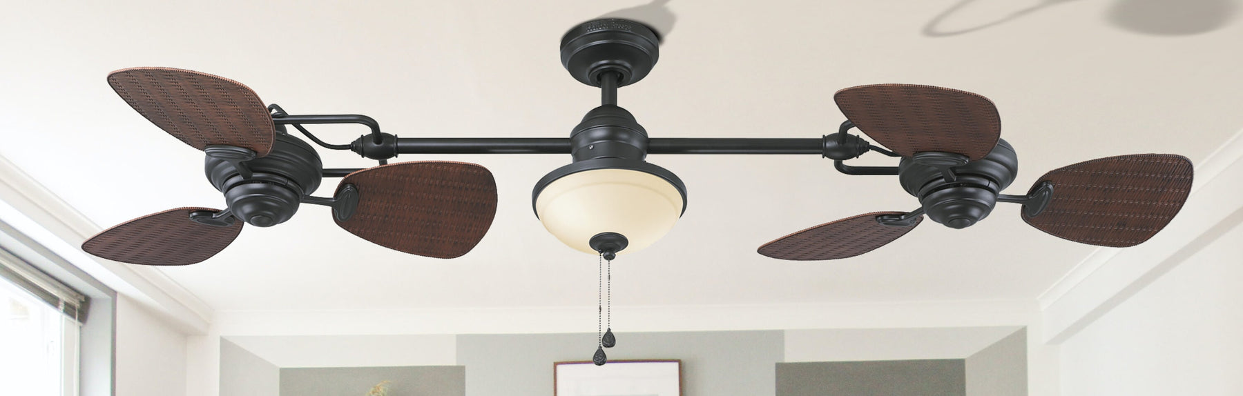 This Harbor Breeze Twin Breeze II features dual fan heads spanning 74 inches to move up to 4,450 CFM in large covered patios and great rooms. An oil-rubbed bronze finish pairs with brown wicker blades and a frosted bowl light for warm, stylish illumination. Damp-rated for indoor/outdoor use, it includes a 4-in downrod and 3-speed reversible AC motor.