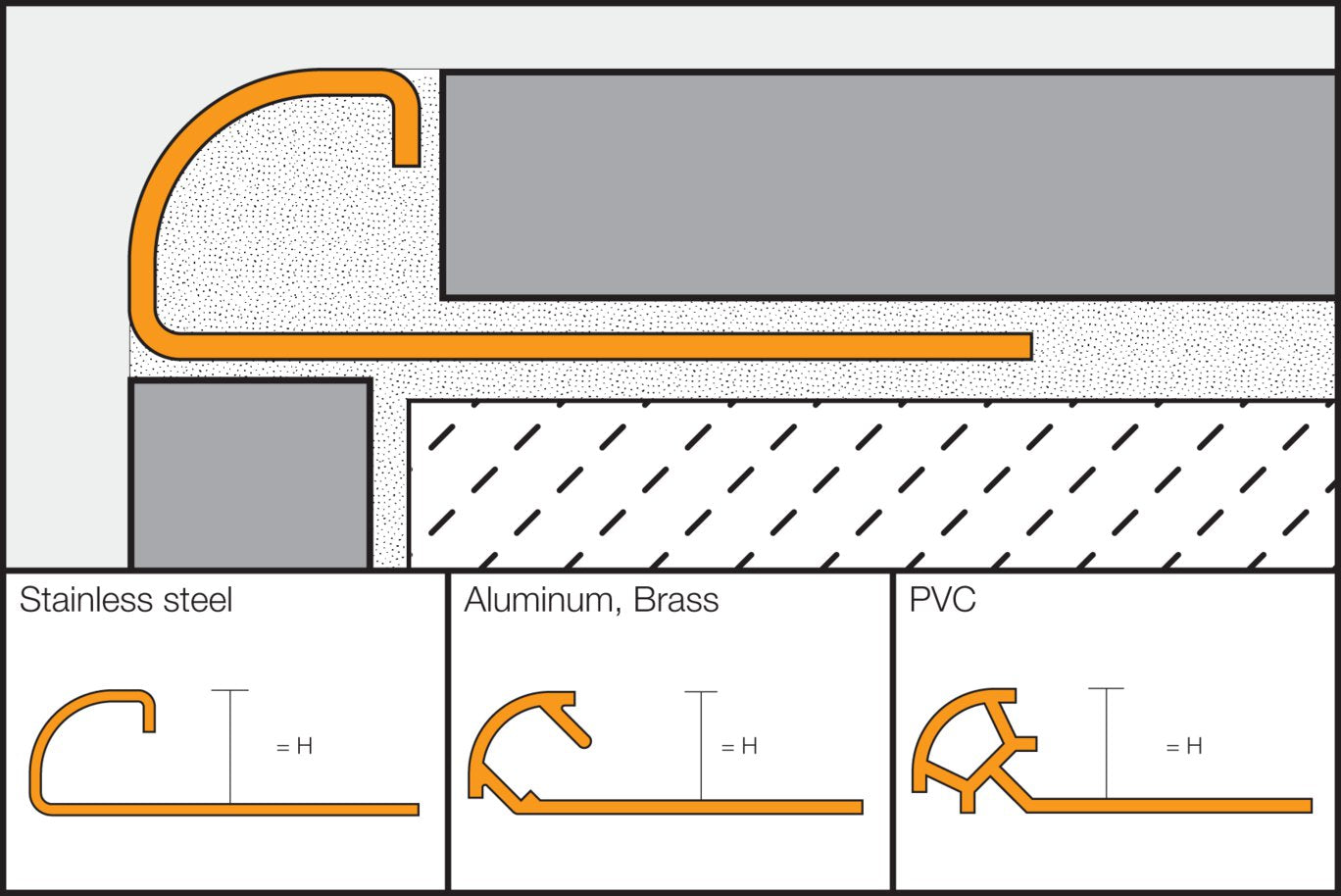 Q: What tile thickness does it work with? A: This item is sized to coordinate with 3/8-in (10 mm) tile thickness RONDEC profiles; verify your profile height matches your tile.