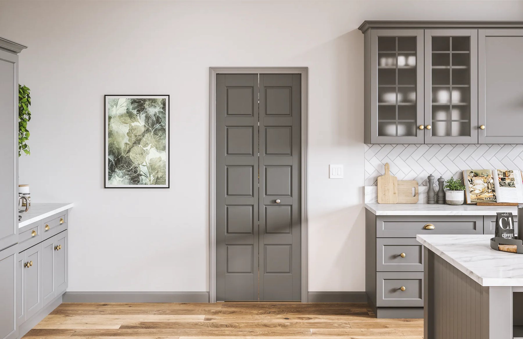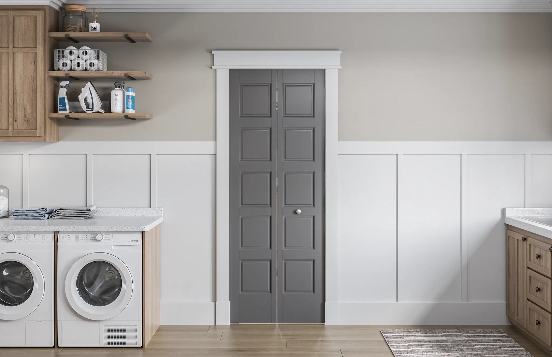 Riverside’s five equal panels bring a tailored rhythm that instantly refines closets and pantries. The Blue Heron finish adds a cool, contemporary note that pairs beautifully with craftsman millwork and transitional cabinetry. Style it with matte black or warm brass hardware for a chic contrast and a curated look. It’s a small upgrade with a luxurious impact, elevating everyday spaces with effortless sophistication.