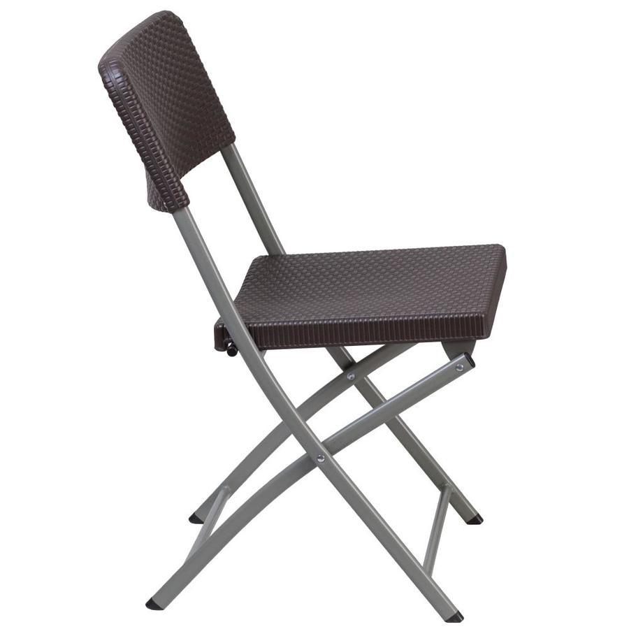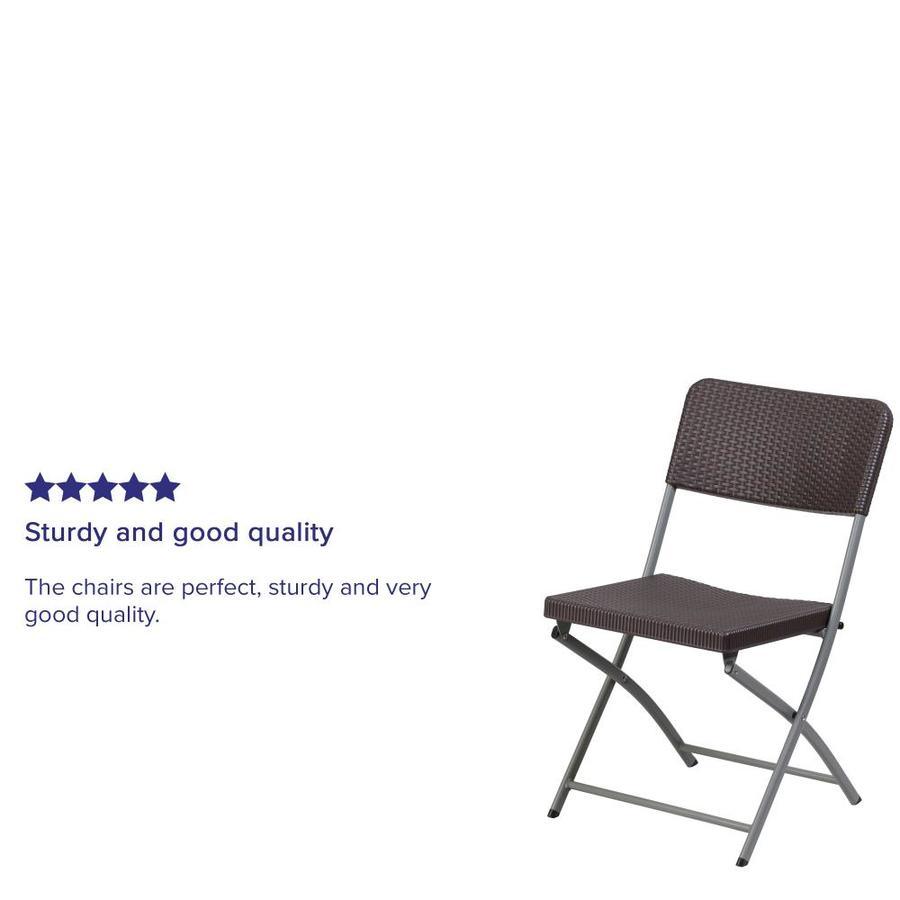 Plastic Folding Chair 440 lb. Weight Capacity Lightweight Design Brown Rattan Plastic Back and Seat Textured Seat Ensures Safe Seating Double Support Braces Steel Tubular Frame, Gray Powder Coated Frame Finish Floor Protector Caps Designed for Indoor or Outdoor Use