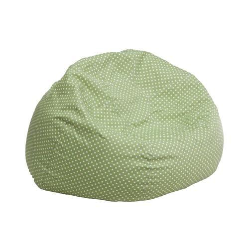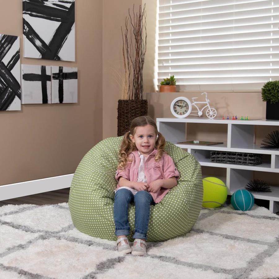 Child Sized Bean Bag Portable Lightweight Design Green Cover with Mini White Dots Cotton-Twill Upholstery Spot Clean with damp cloth Machine Washable Removable Slip Cover Wash using Cold Water; Do Not Bleach Safety Metal Zipper secures polystyrene polymeric beads