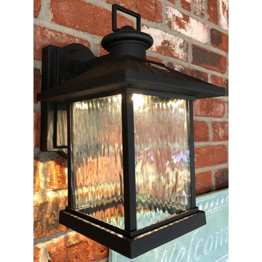 Clear water glass and black finish No lamps to replace Built-in dusk to dawn photocell ensures the light stay off during daylight hours Integrated LEDs, 6 watts, 450 lumens, CRI 80, 35000 hours average LED life (over 12 years at 7.5 hours per night) Warm 3000K color Dimensions are 9.5-in D x 12-in H x 8-in W All mounting hardware is included ETL listed