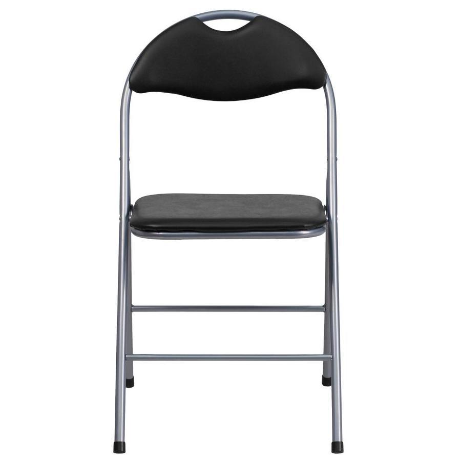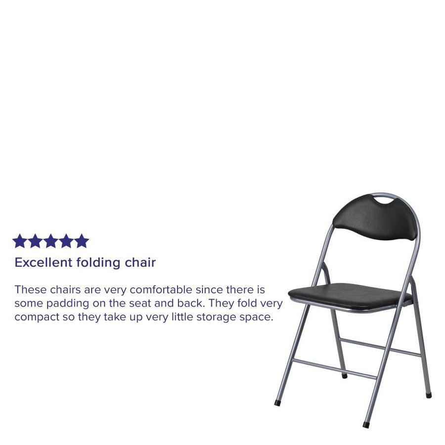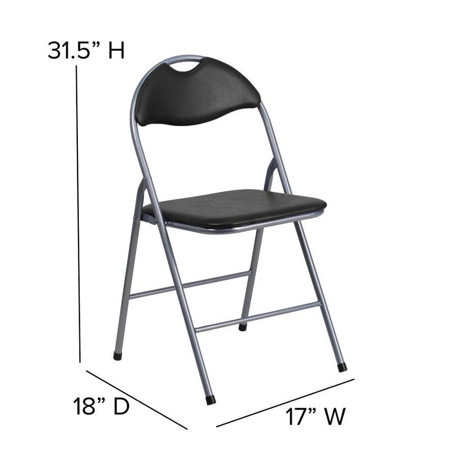 Padded Metal Folding Chair 300 lb. Weight Capacity Black Vinyl Upholstery 1-in Thick Padded Seat with CAL 117 Foam Silver Powder Coated Frame Finish with Non-Marring Floor Glides Carrying Handle Cutout for easy movement Designed for Commercial or Residential Use Folded Size: 17-inW x 1.75-inD x 35.75-inH Top Review: I purchased these chairs for a business studio and am very pleased with the quality for the price. They are light but not flimsy and are nicely padded on the seat and back