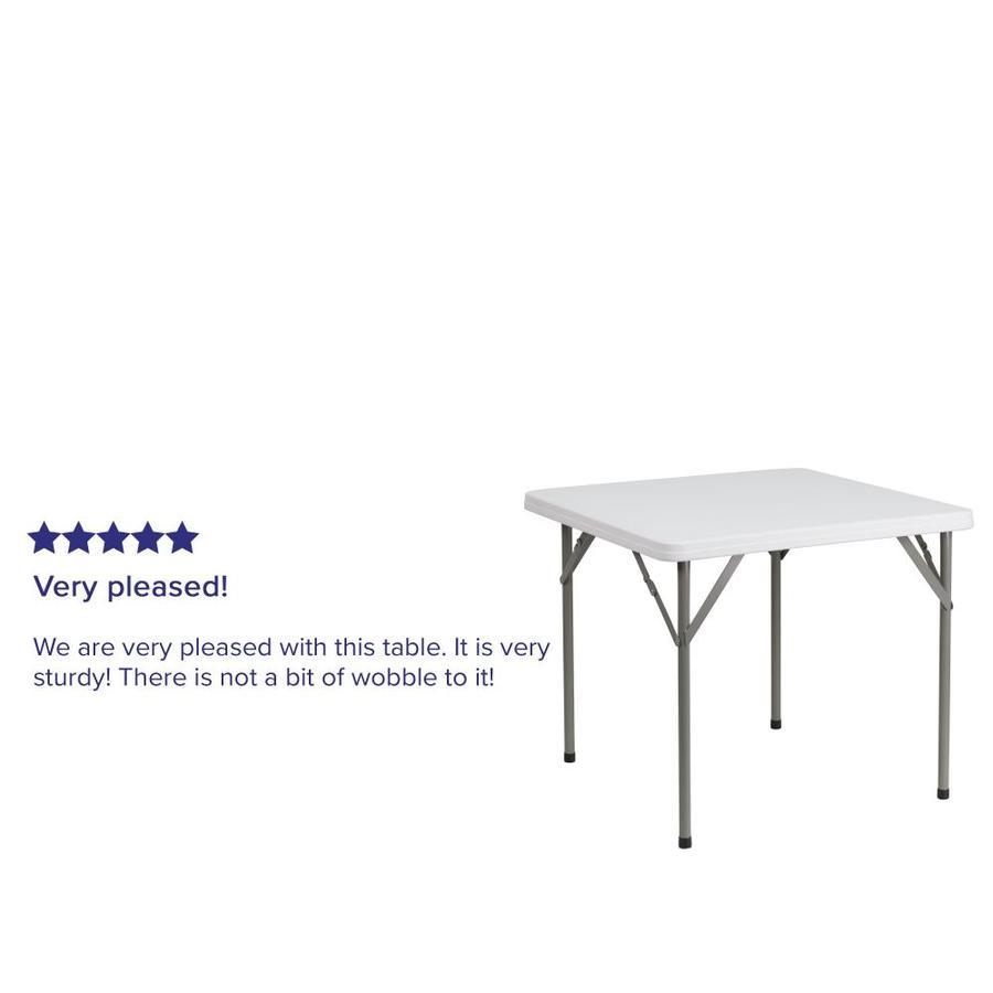Ready To Use Commercial Table 2.85-ft Folding Table Seats up to 4 Adults 220 lb. Static Load Capacity 1.75-in Thick Granite White Top is waterproof, impact and stain resistant Gray Powder Coated Locking Legs with protective floor caps Legs fold underneath top for flat storage