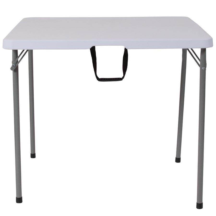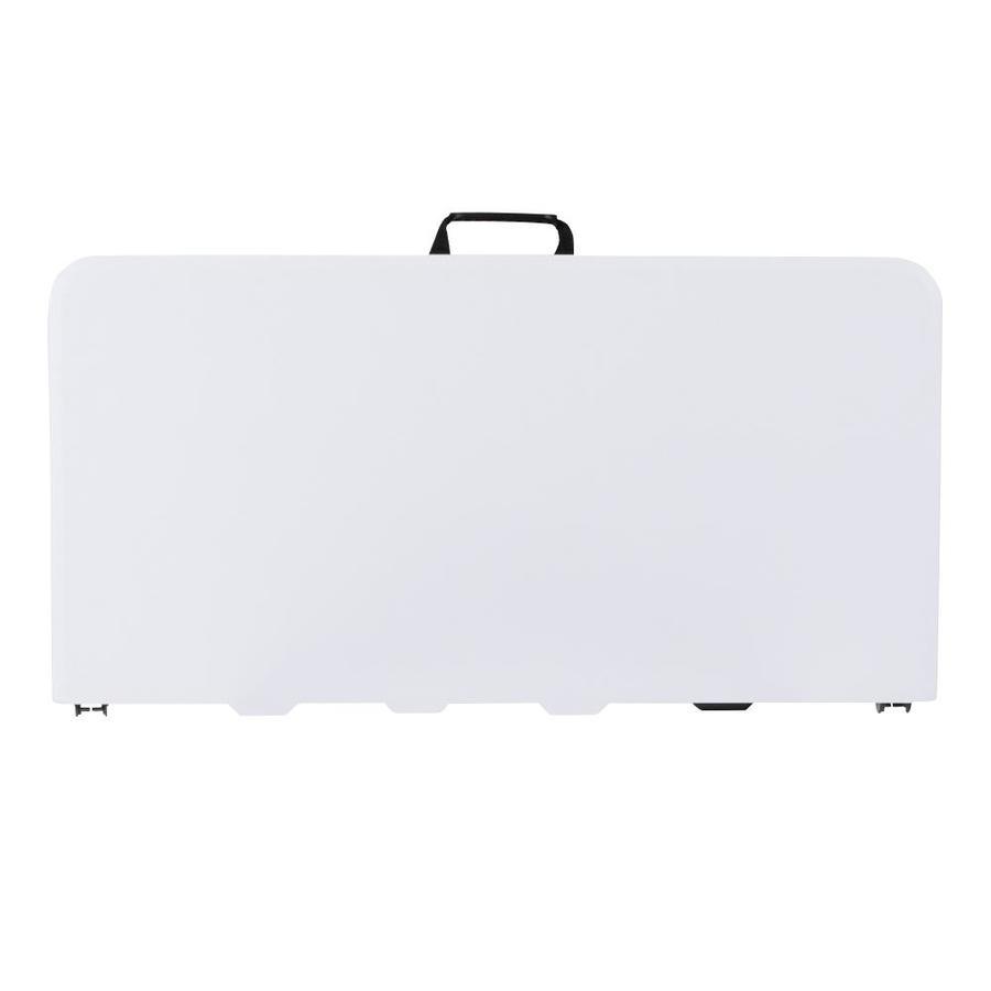 Multipurpose Folding Table 2.79-ft Folding Table Seats up to 4 Adults 165 lb. Static Load Capacity 1.5-in Thick Granite White Top is waterproof, impact and stain resistant Folds in half for storage and travel Includes convenient carrying handle Frame adjusts 8-in to accommodate various seat heights Gray Powder Coated Locking Legs with protective floor caps