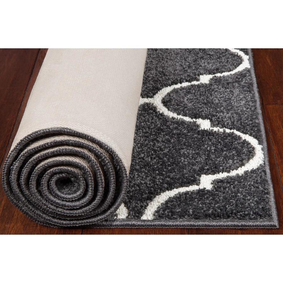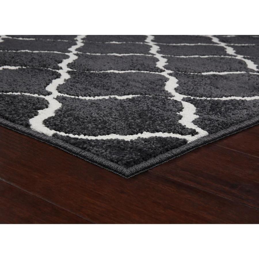 Allen + Roth accent rug featuring a charcoal background accented by a cream tile pattern Machine tufted of 100% Olefin stain and fade resistant construction- great for high traffic areas Machine washable for easy care Skid resistant latex backing Proudly made in the USA Level cut and loop construction Durable 1/2 in pile height Available in multiple sizes Perfect for bedrooms, living rooms, dining rooms, or home office
