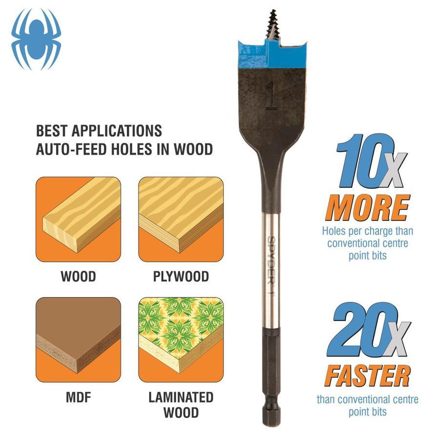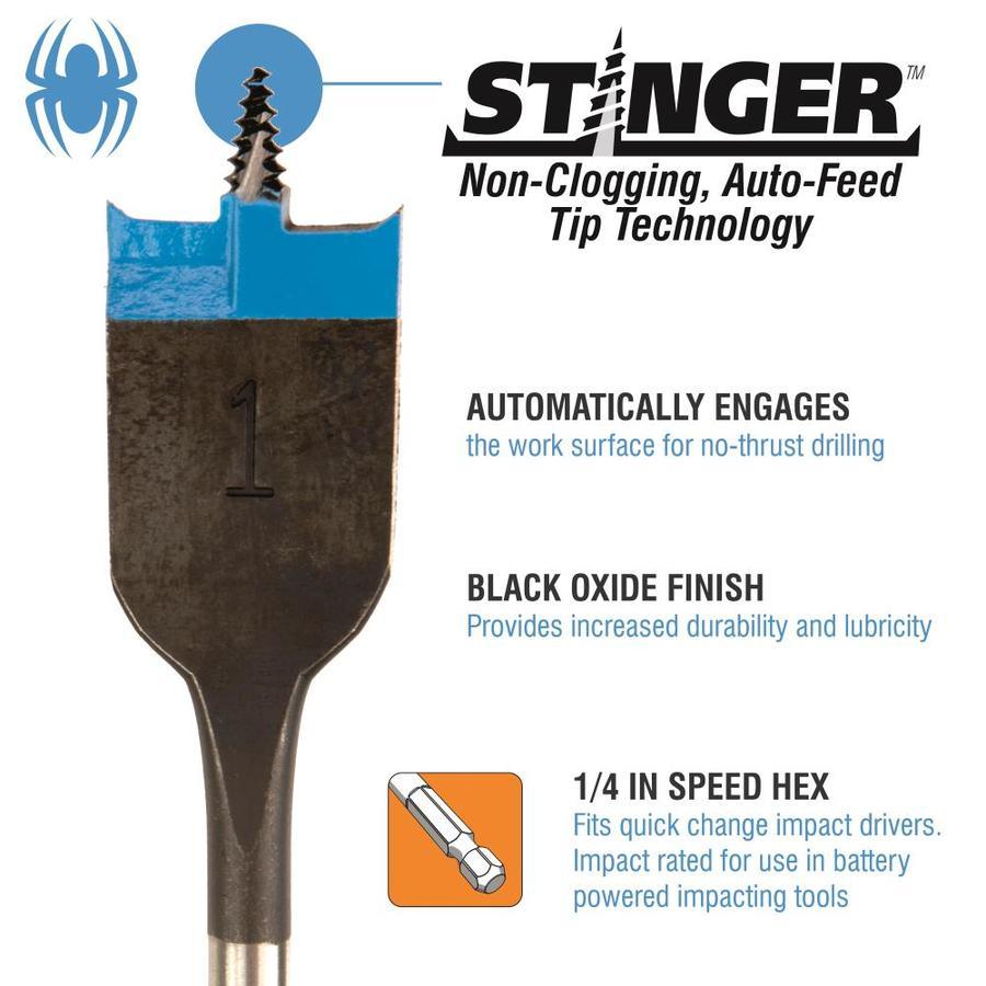 Unlike other spade bits with a self-feeding thread point, the Spyder stinger(TM) thread point won't clog and it won't wander-making you more productive