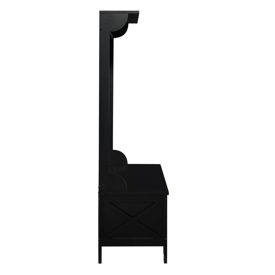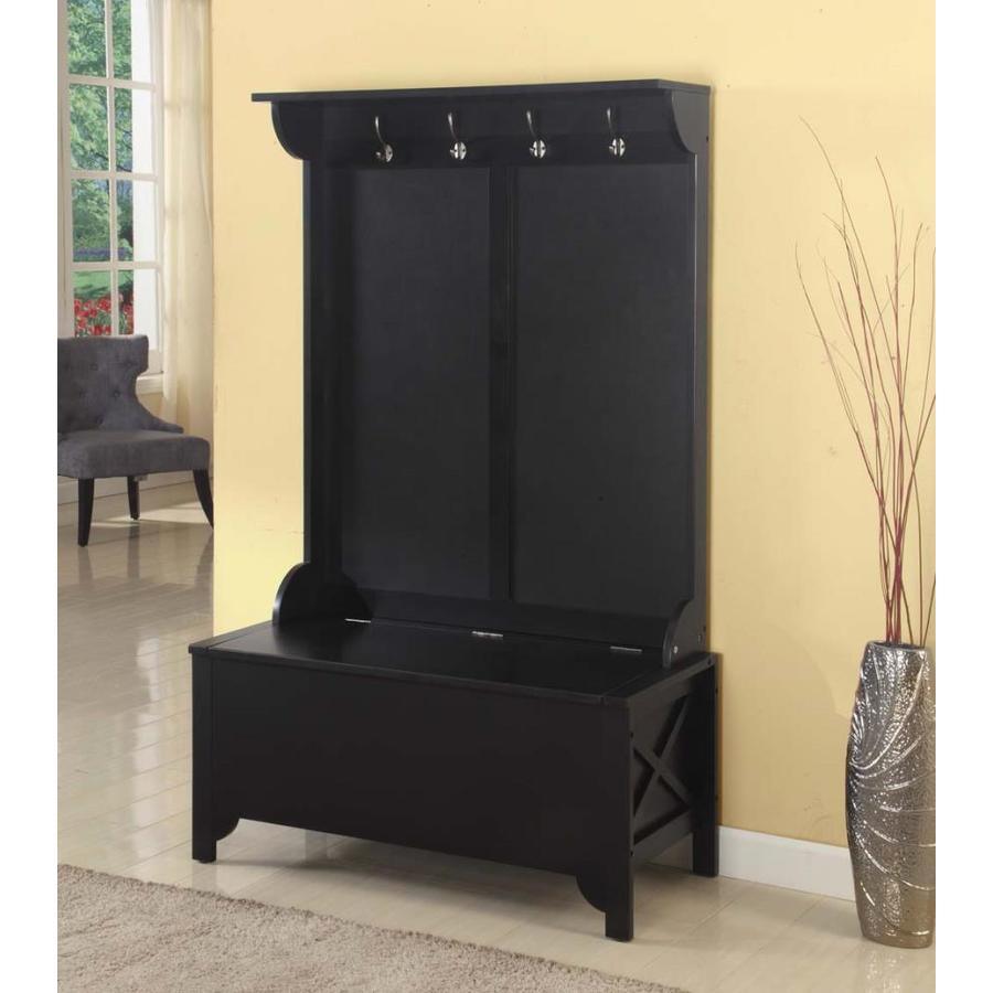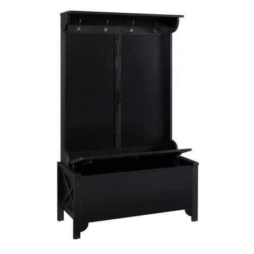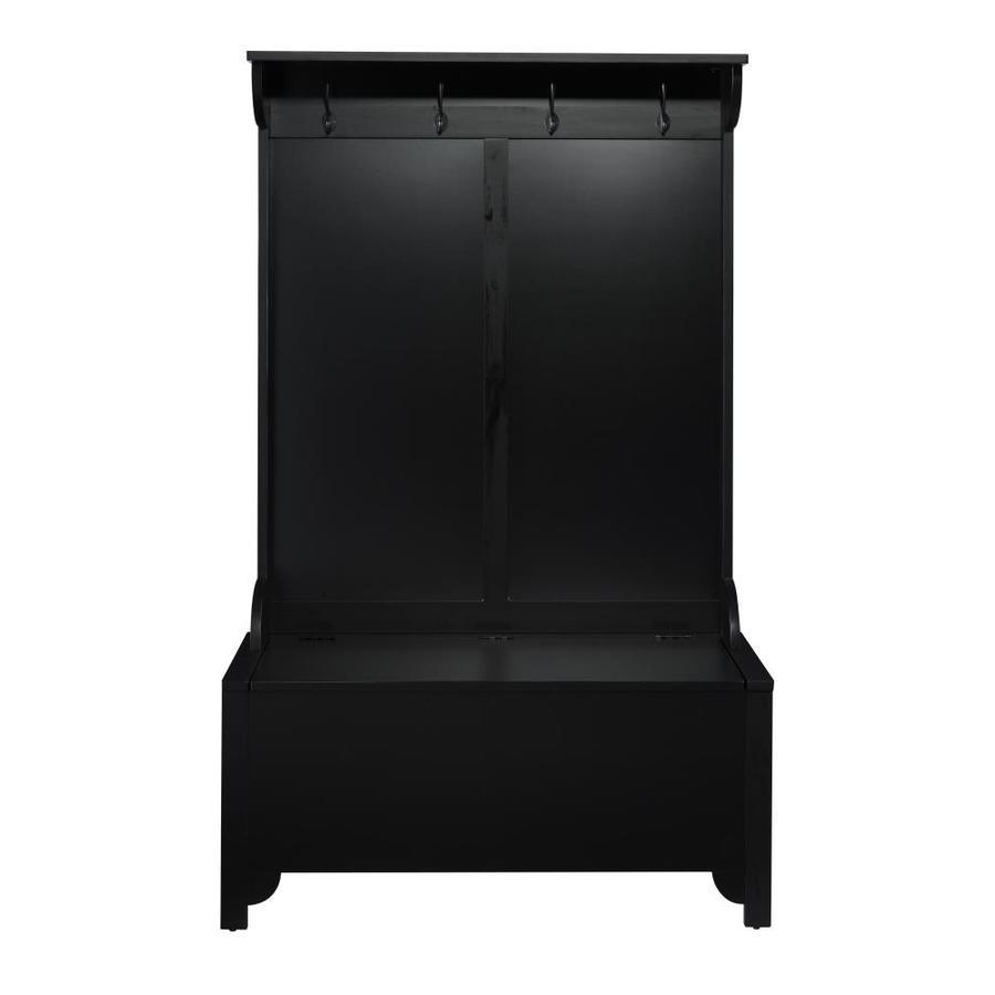Provides function and style to any room in your home Features four coat hooks Solid seat Includes spring loaded lid stays to keep the seat from slamming Antique black finish with red rub through