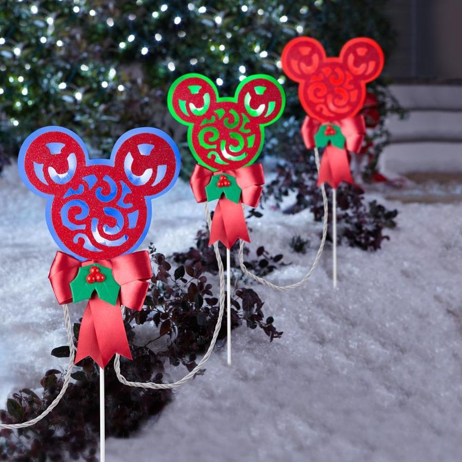 Set of 3 pathway stakes with beautiful color morphing™ technologystakes in the outline of mickey's head decorated with ornate red scrolling Part of the Disney magic holiday™ collectionfeatures bright, energy-efficient LED lighting Features bright, energy-efficient LED lighting Perfect for outdoor Christmas decorations Mix and match with other items from the collection to create the Disney holiday of your dreams Part of the Disney magic holiday collection Available exclusively at ARB265W © Disney