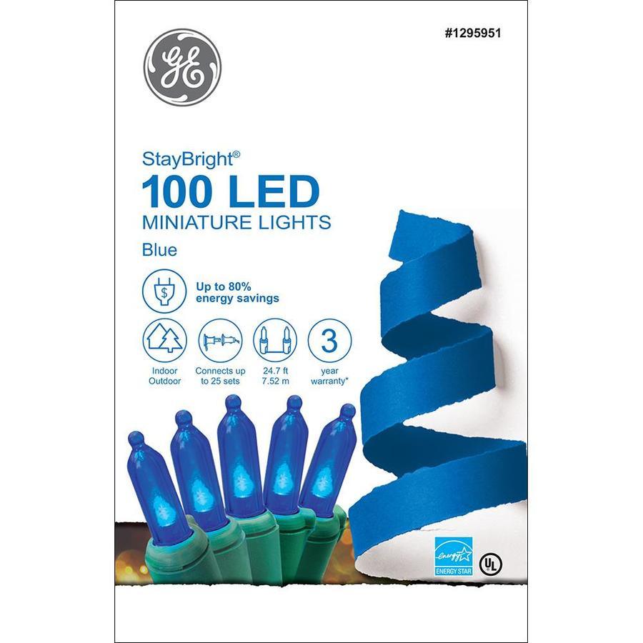 100-Count GE StayBright LED blue miniature Christmas string lights Green cord with 24.7-feet lighted length matches your Christmas decor and illuminates your home's interior or exterior Can connect with up to 25 sets to make decorating your home a breeze Replacement bulbs and fuses included for added convenience ENERGY STAR qualified products help you save money on utility bills without sacrificing performance, style or comfort Available only at ARB265W