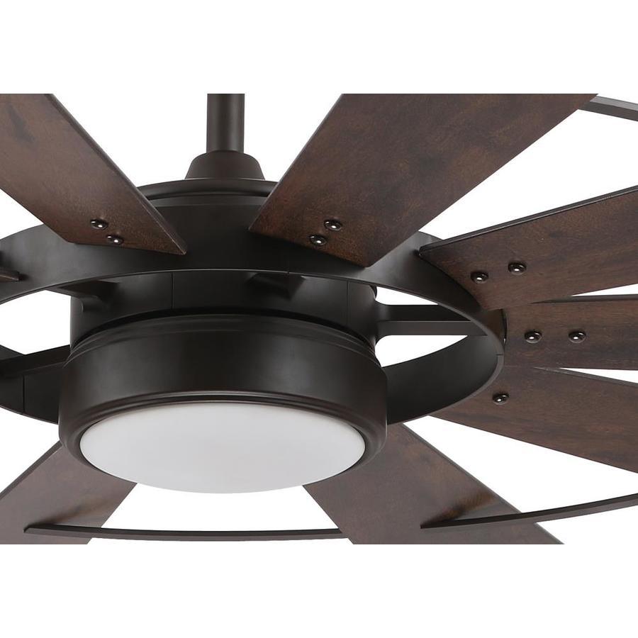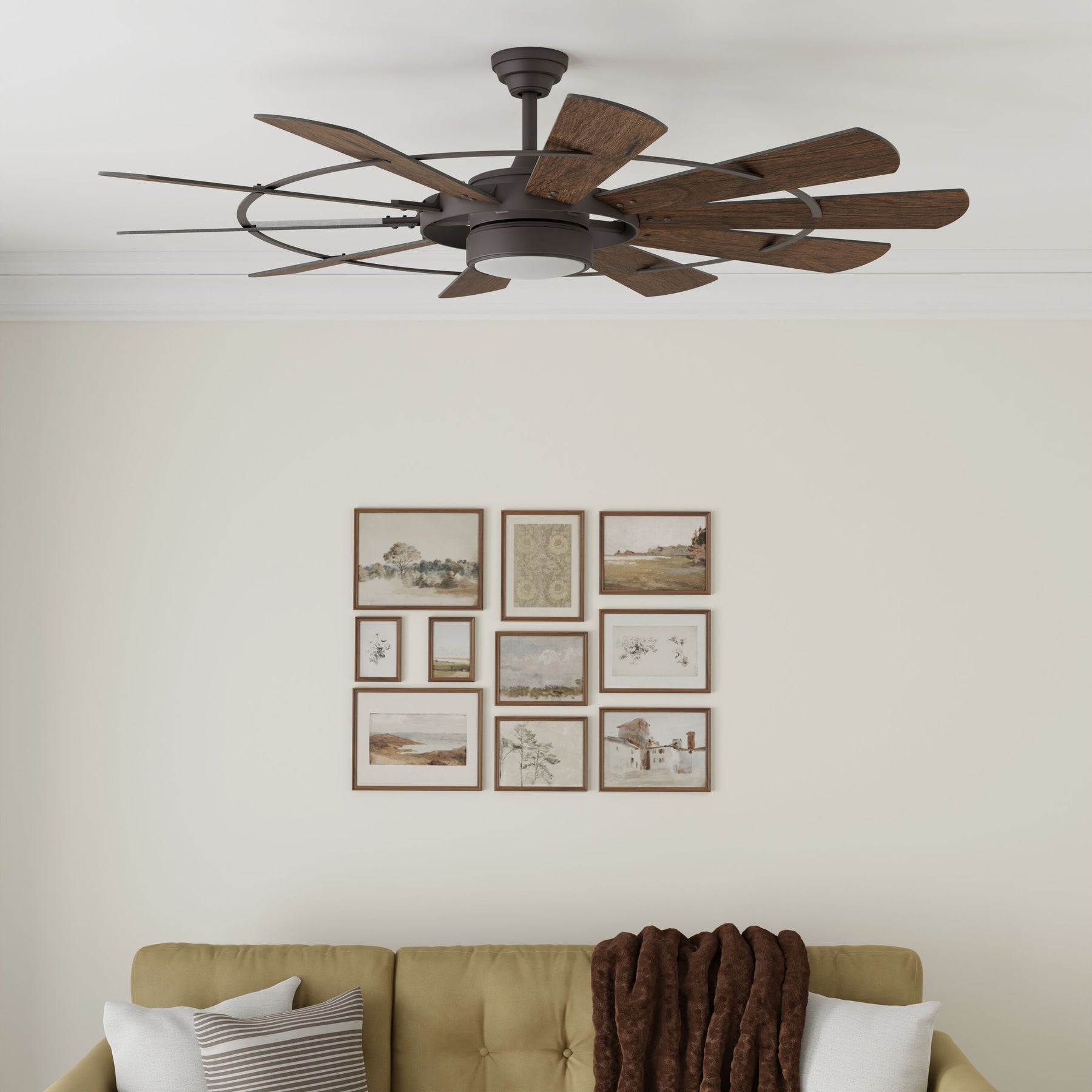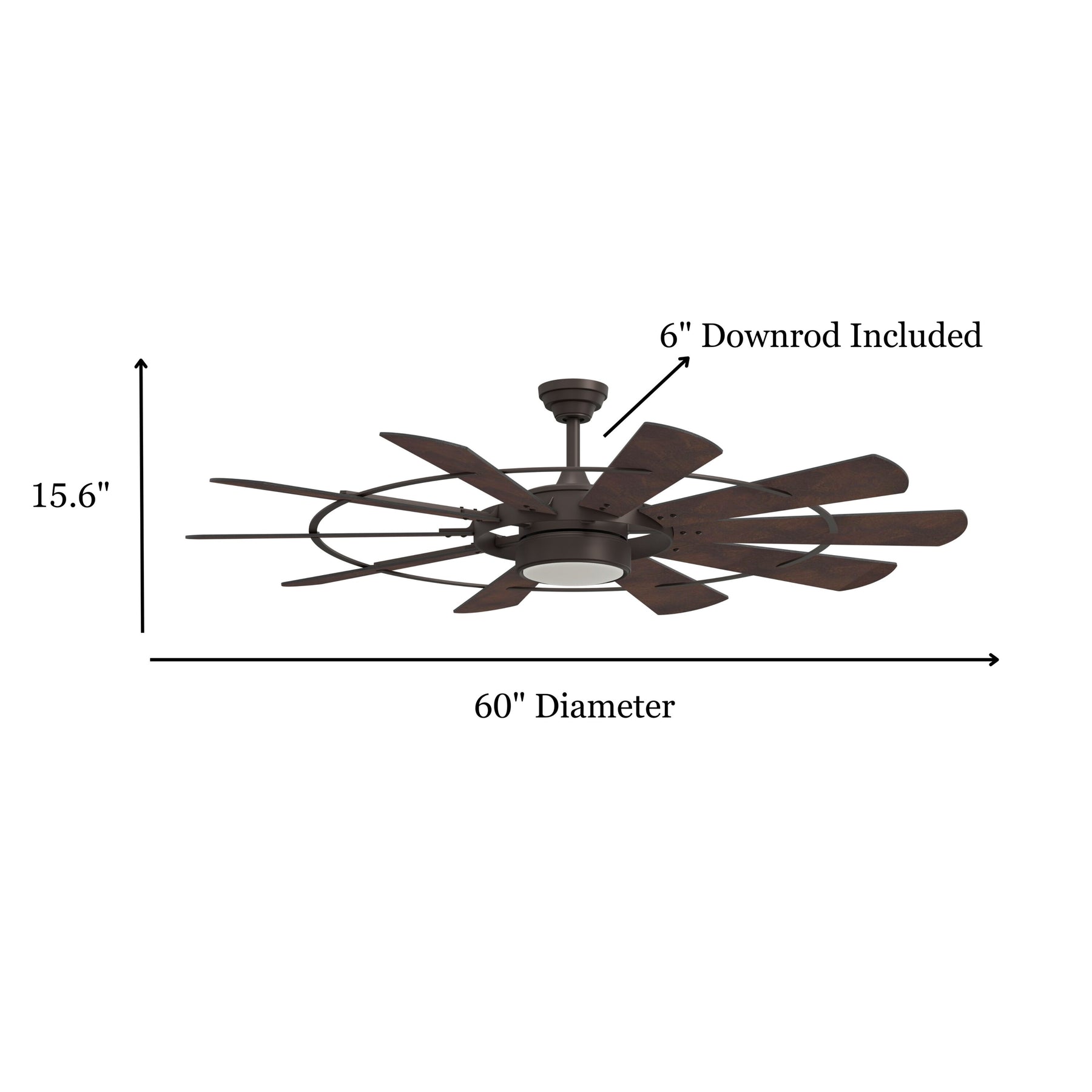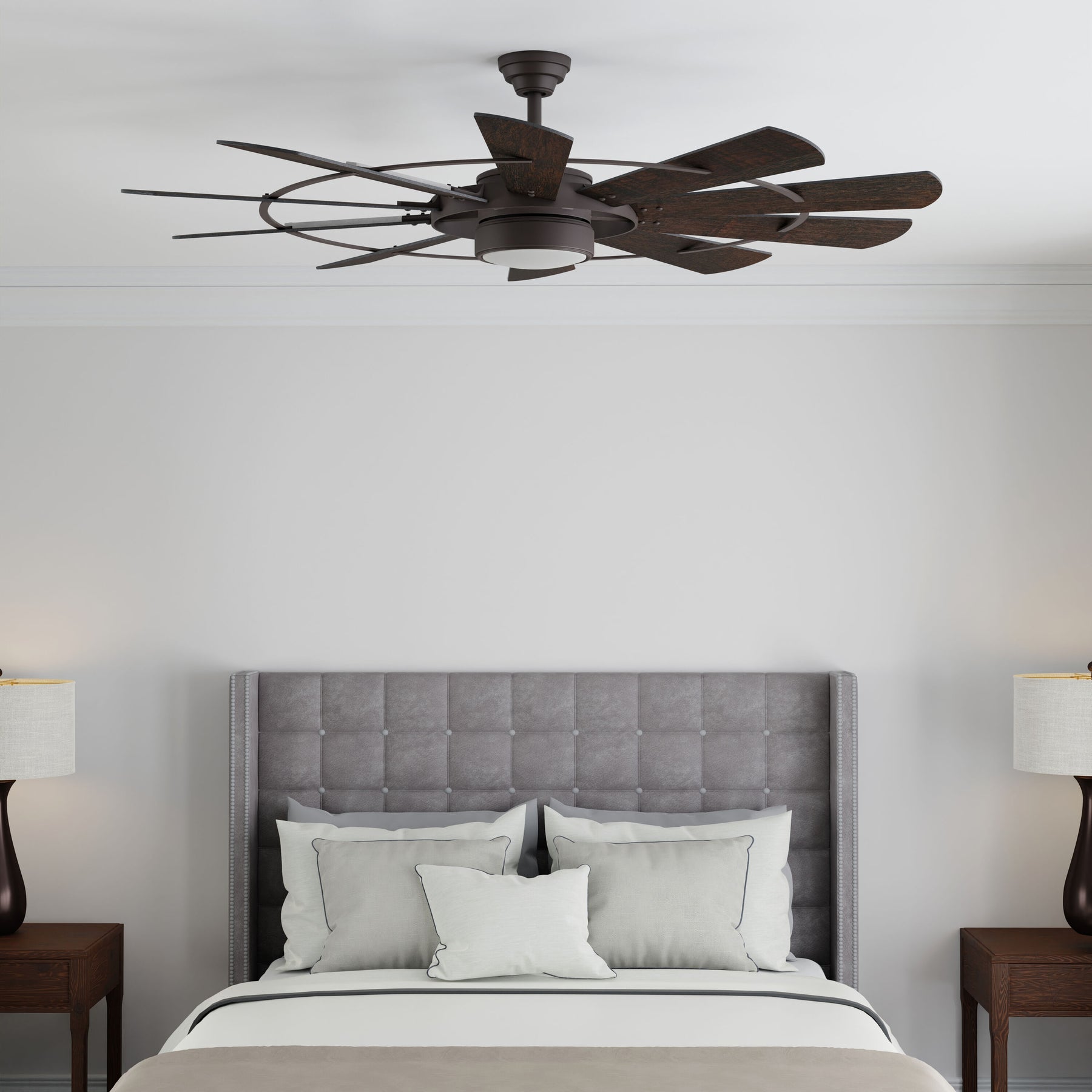 A windmill-style 60-inch indoor ceiling fan in bronze with mahogany blades, featuring an integrated dimmable LED light and included remote. Ideal for great rooms, it delivers strong airflow with a reversible DC motor and dual-mount installation.