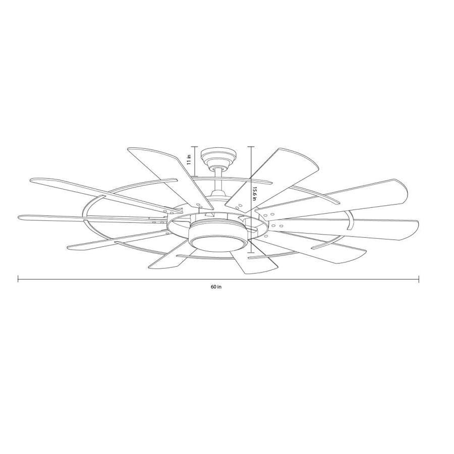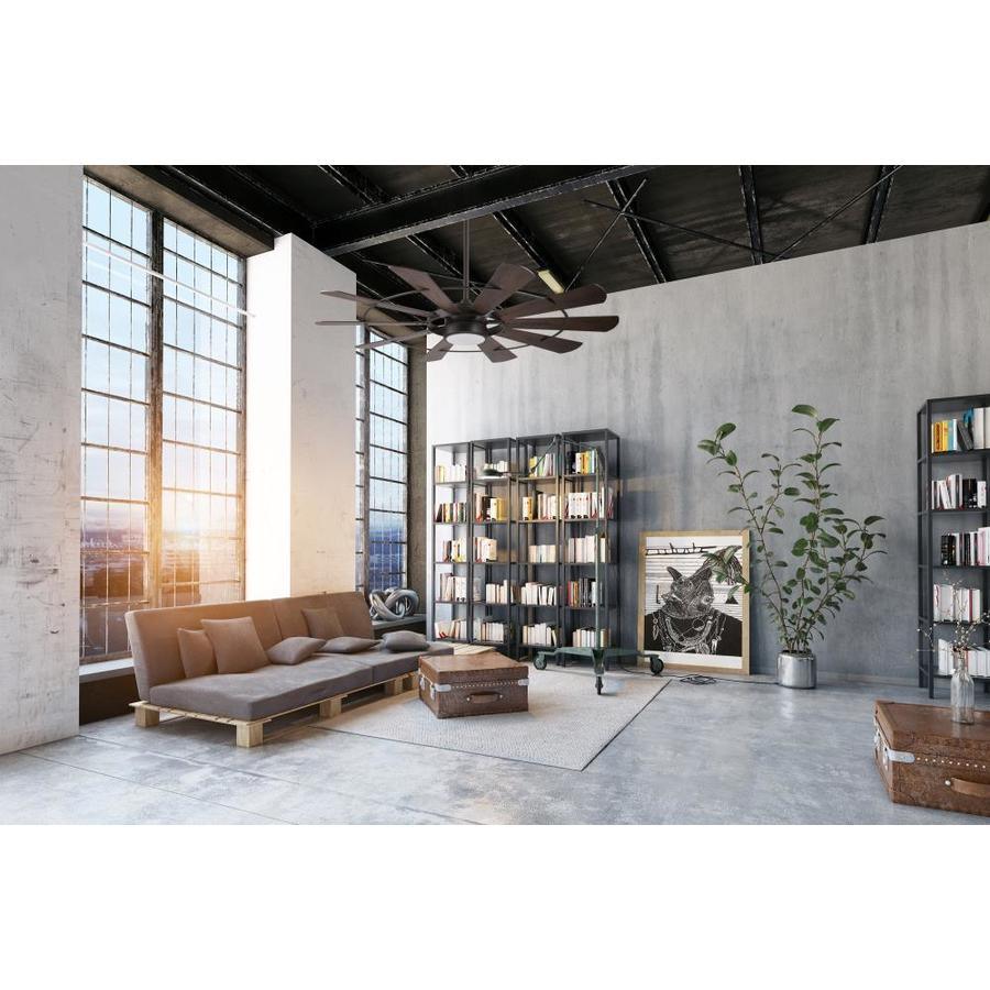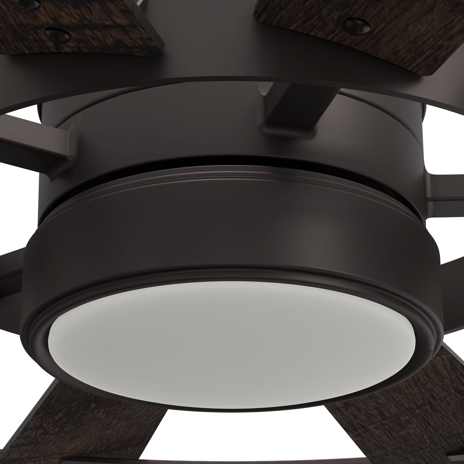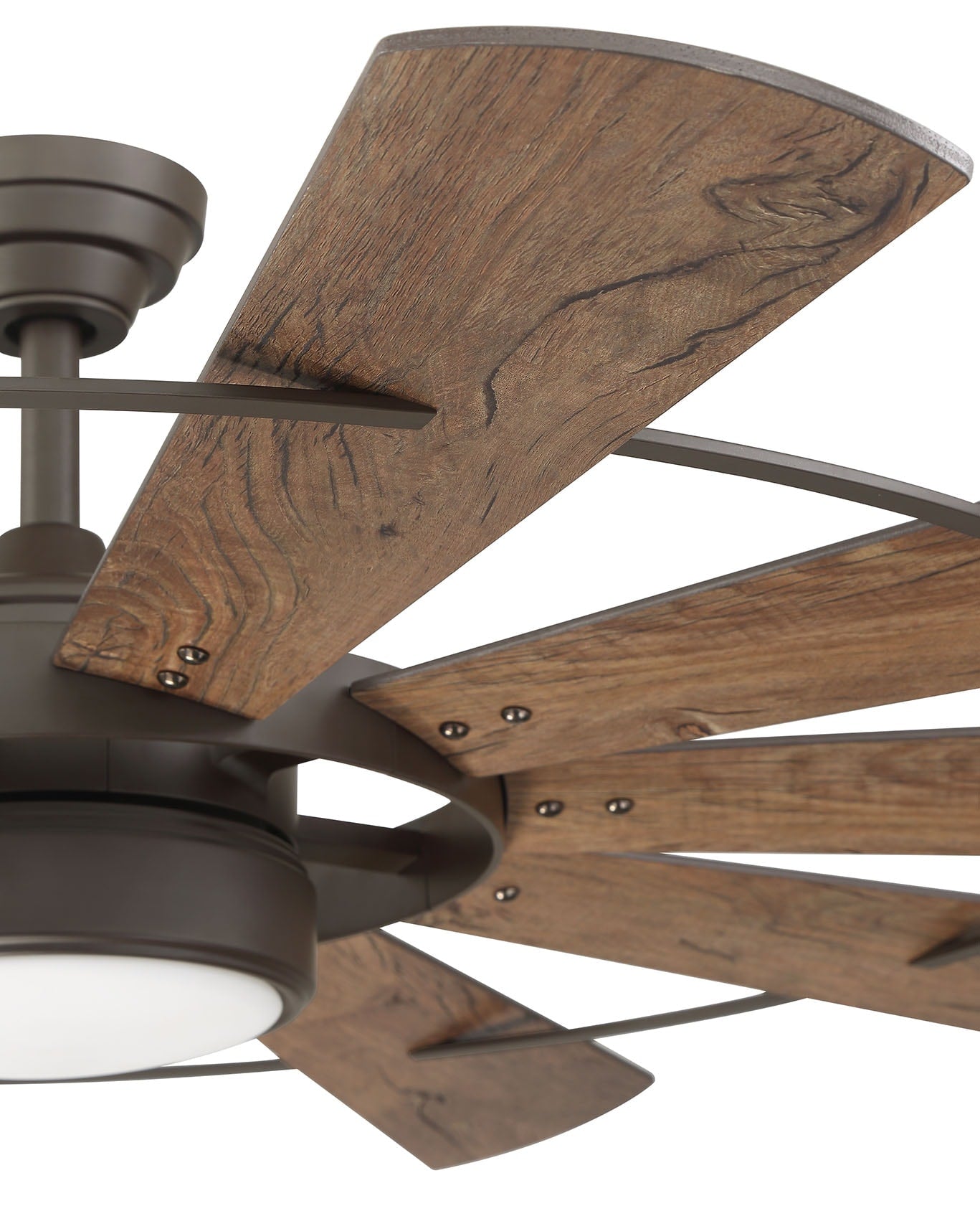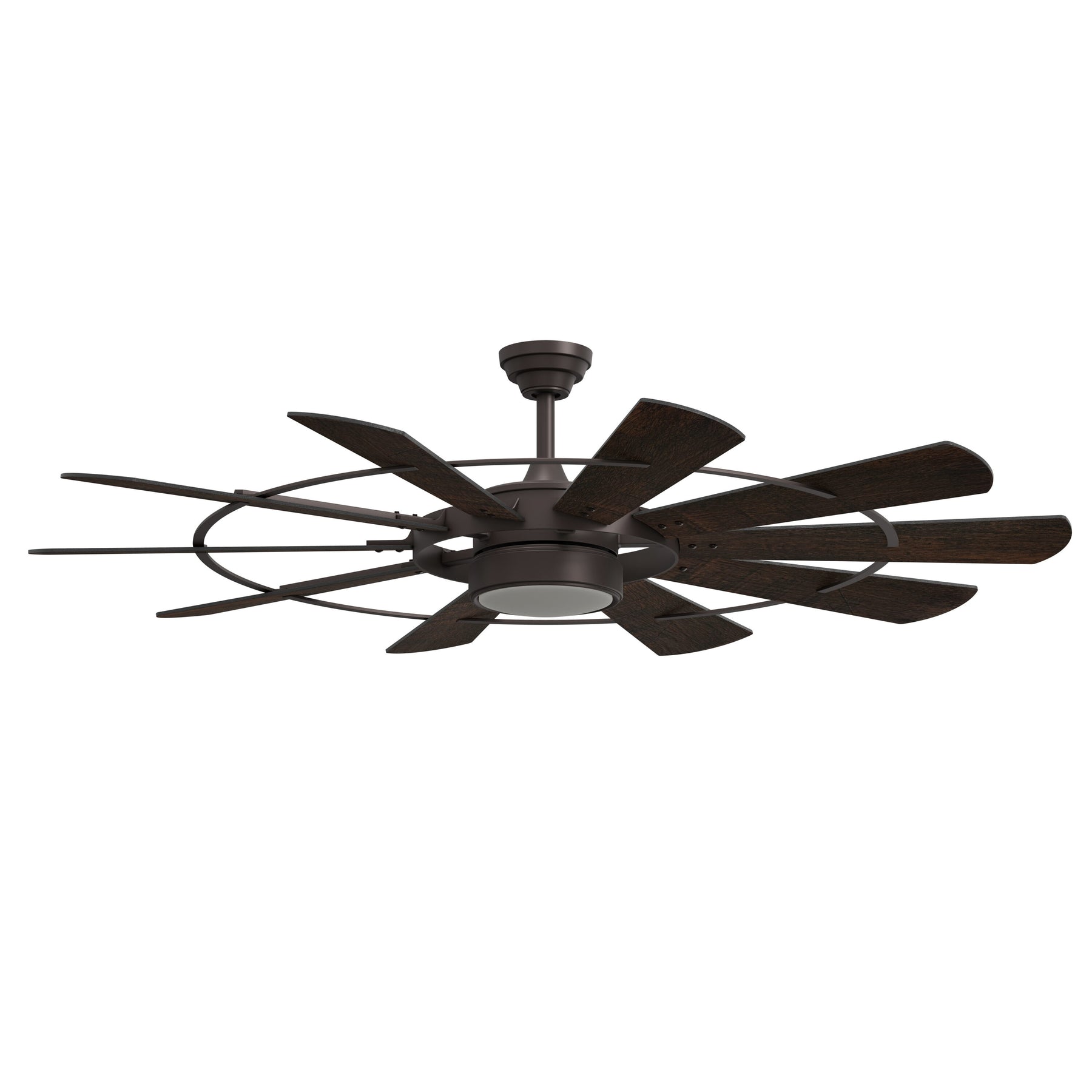 A windmill-style 60-inch indoor ceiling fan in bronze with mahogany blades, featuring an integrated dimmable LED light and included remote. Ideal for great rooms, it delivers strong airflow with a reversible DC motor and dual-mount installation.