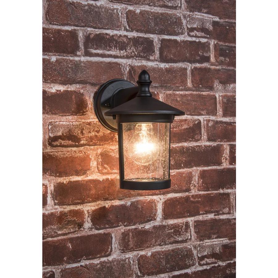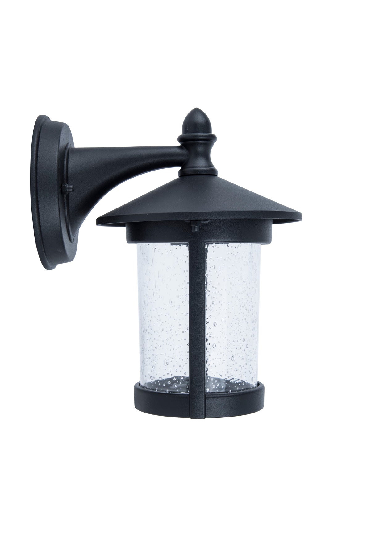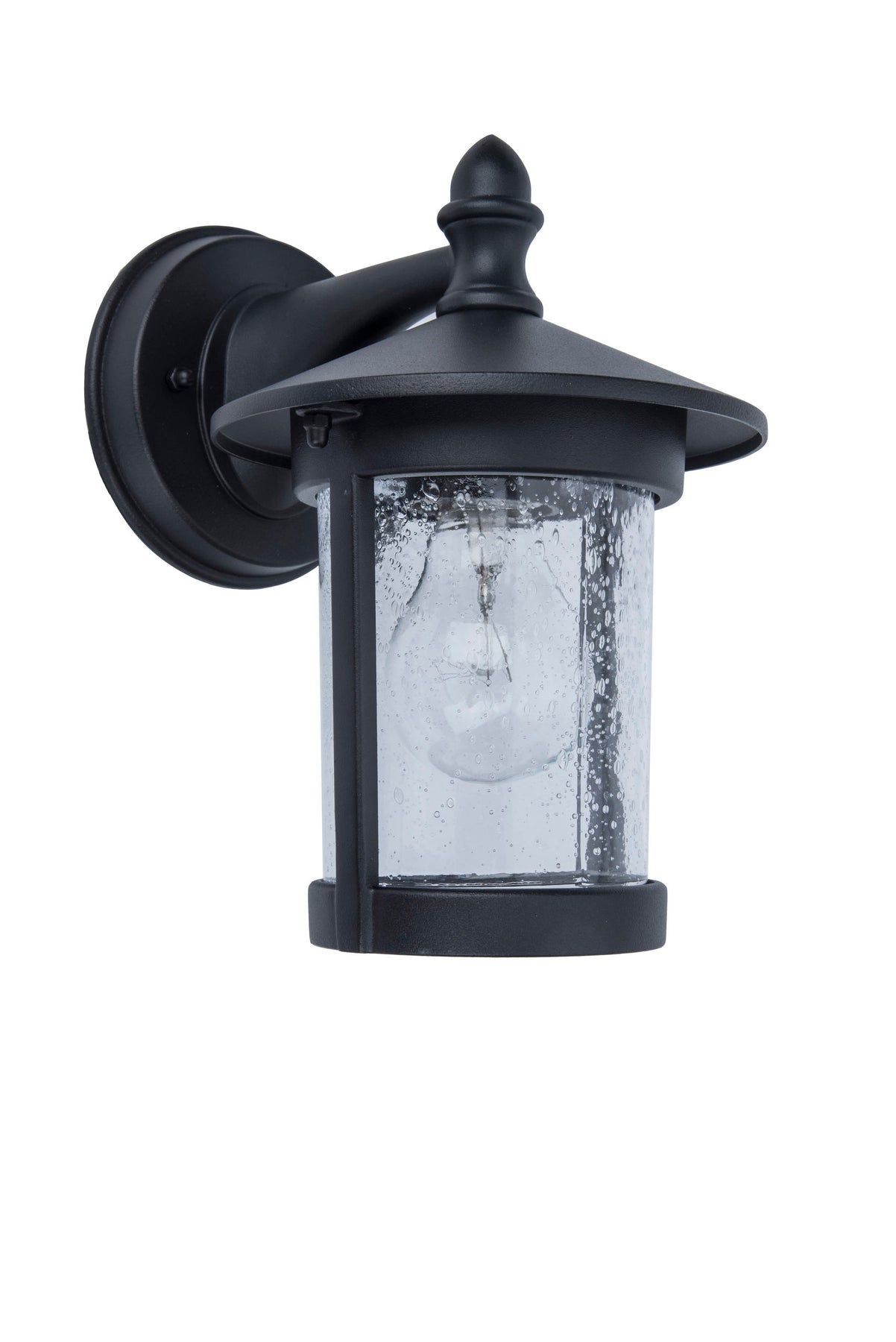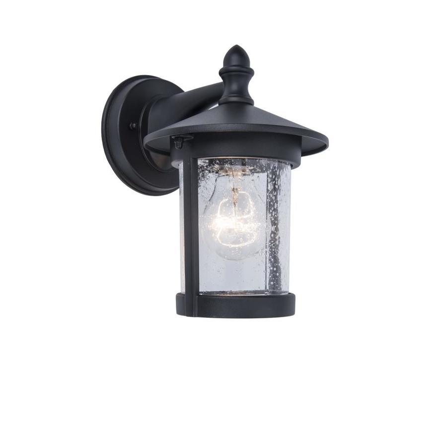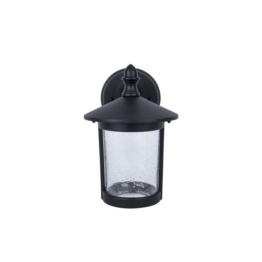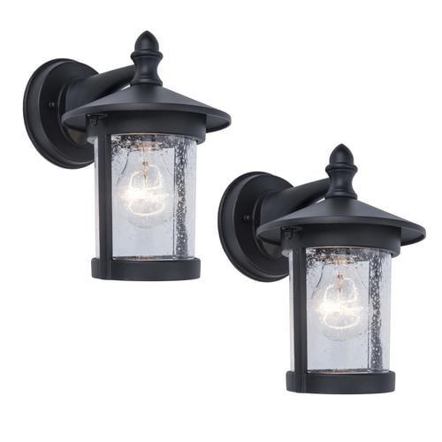 This 2-pack of outdoor wall lanterns pairs a durable matte black, cast-aluminum build with seeded glass for classic curb appeal. Hardwired and wet-rated, each fixture uses a single medium base (E-26) bulb up to 60W to illuminate entries, porches, or pathways.