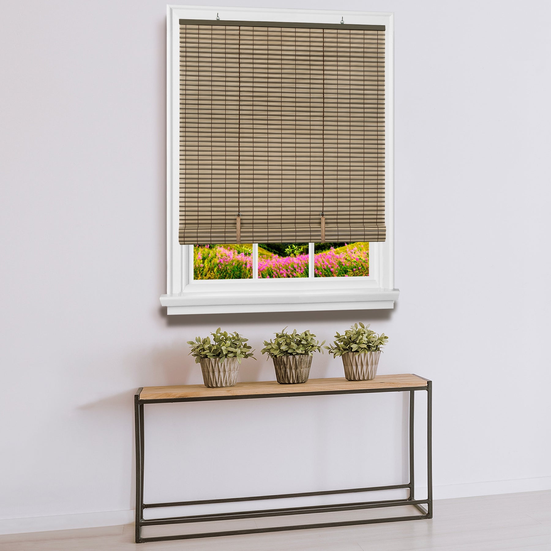 These cordless Veranda roll-up blinds by Achim feature 0.25-in vinyl oval slats in a two-tone cocoa/almond finish that provide privacy while softly filtering light. Designed for easy inside or outside mounting, they’re durable, washable, and safe for homes with kids and pets.