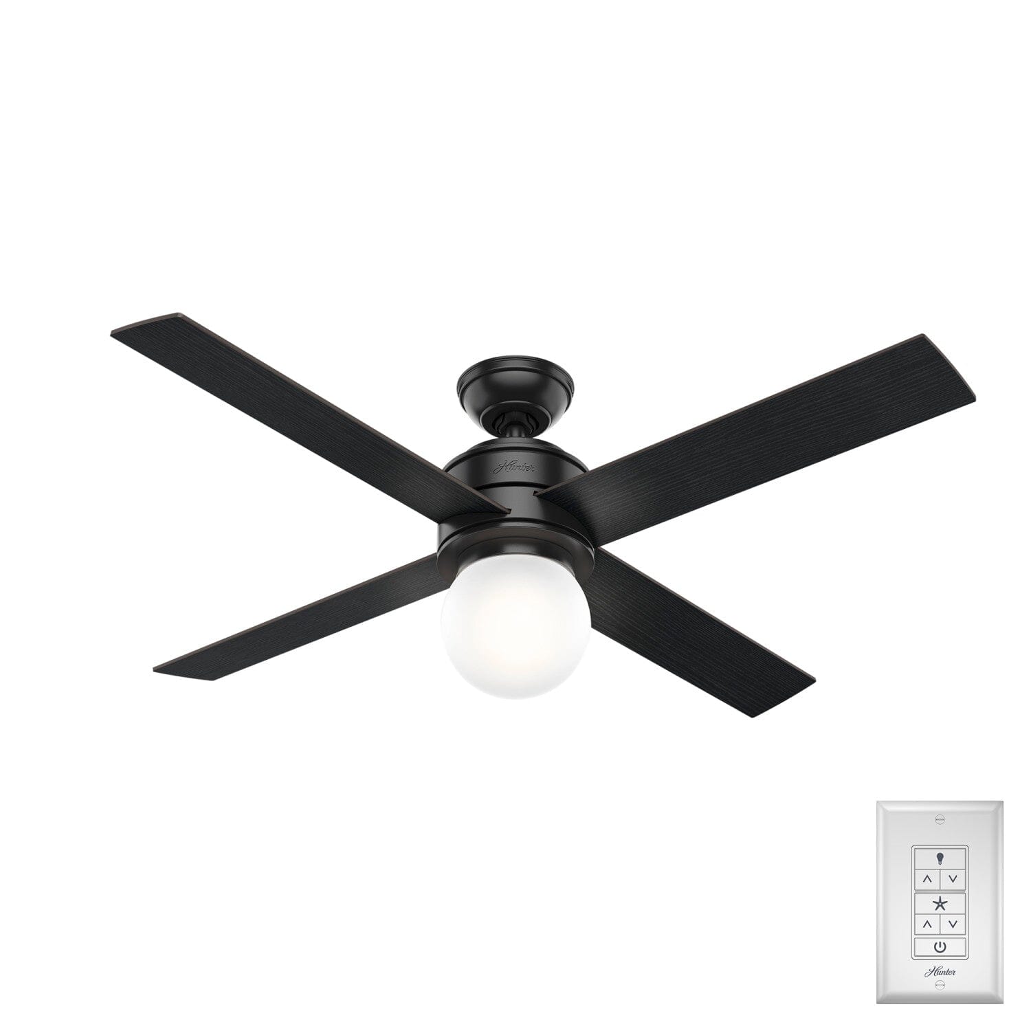 The Hunter Hepburn pairs a vintage-inspired globe light with modern performance for large rooms. Its 52-inch, 4-blade design features a quiet, reversible WhisperWind motor and dimmable LED lighting, all controlled from an included wall-mounted remote.