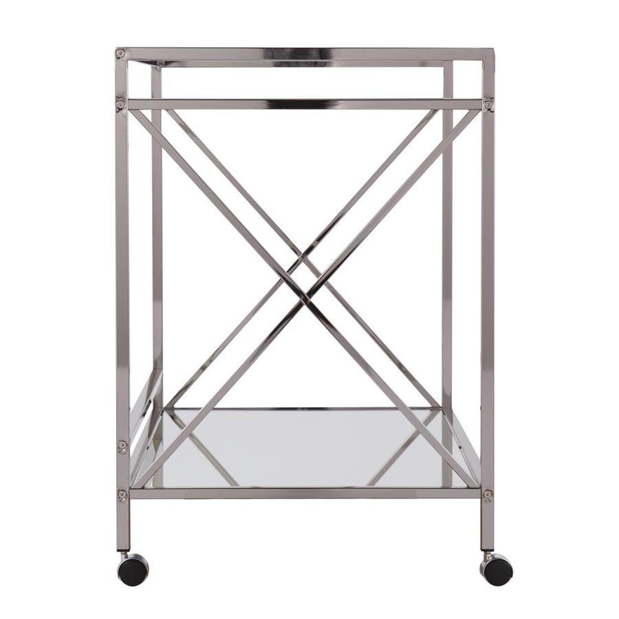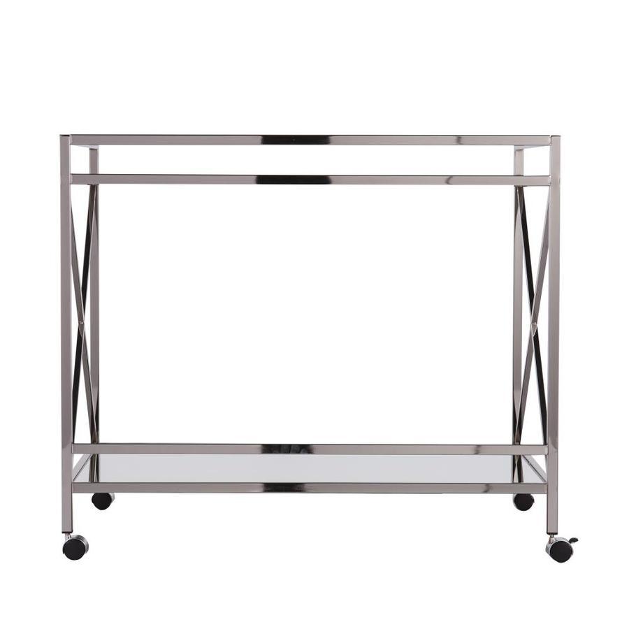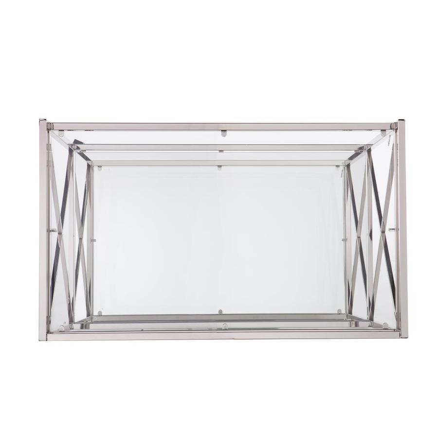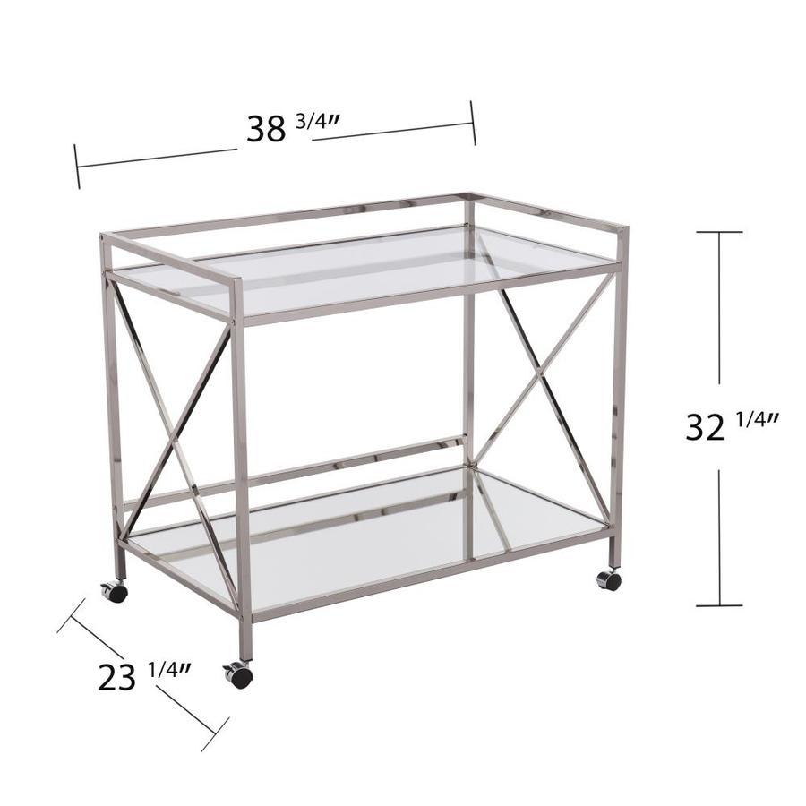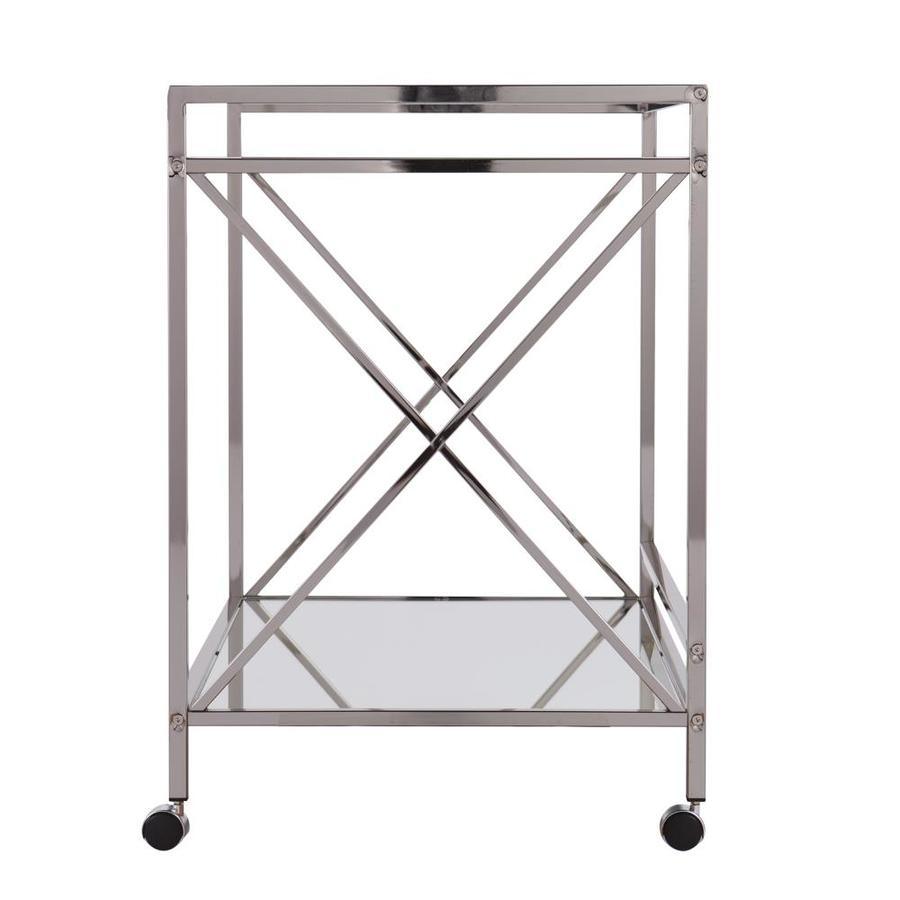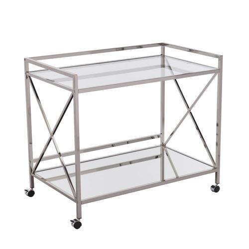 Evokes 1920s luxury with juxtaposition of metal, glass, and mirror
